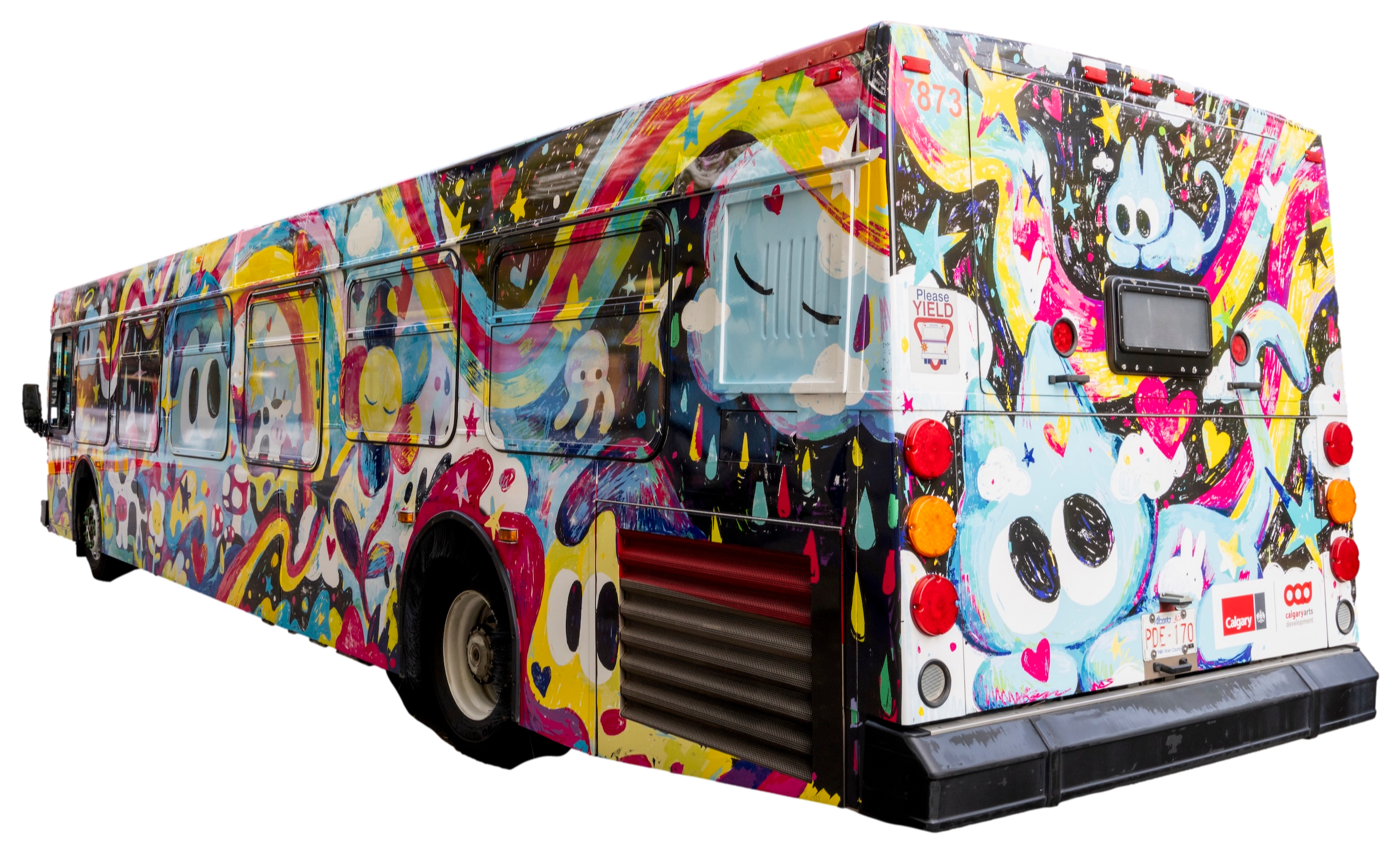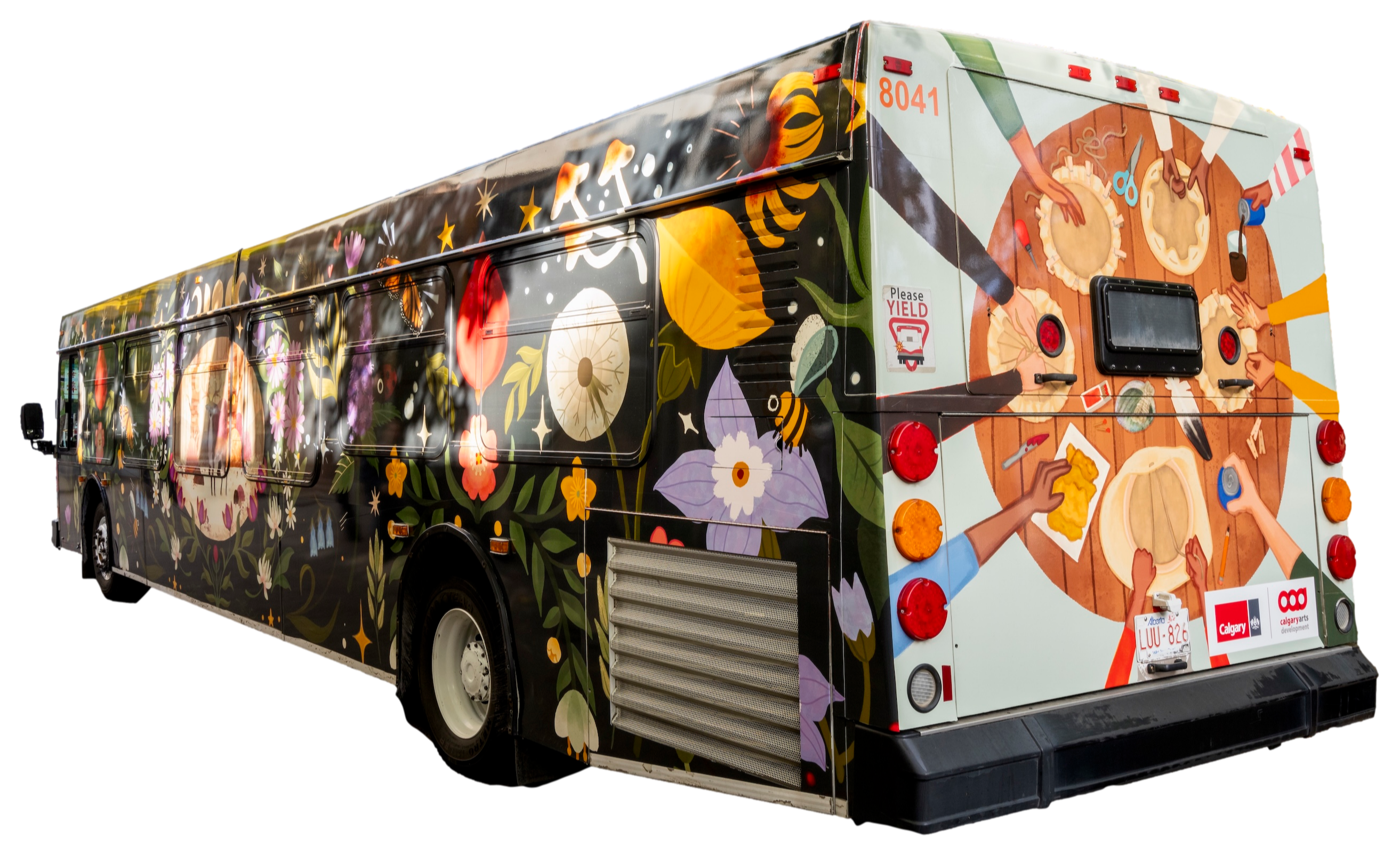 To help bring public art into a variety of areas and communities throughout the city, Calgary Arts Development invited artists to use a public transit bus as their canvas for a new original artwork. This spring, a call went out to artists to submit their qualifications to wrap a public transit bus with art. During the selection process, we identified an opportunity to wrap two additional buses, bringing the total to seven.