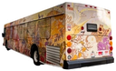 This artwork depicts Indigenous people engaged in drum-making against the backdrop of the Calgary skyline and the Rocky Mountains.Bus