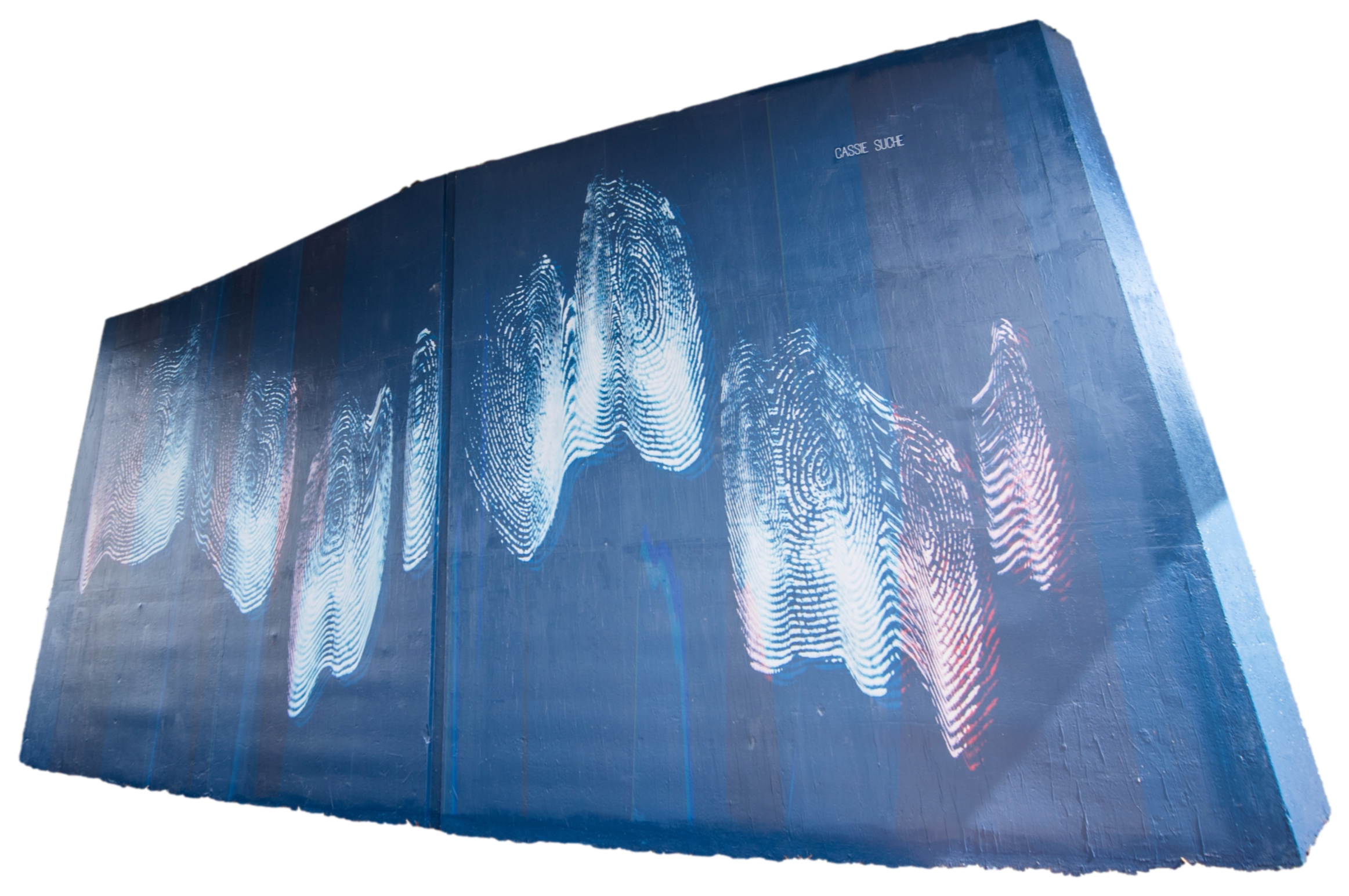 Commissioned by CMLC, Touch Traces by Calgary artist Cassie Suche is a temporary mural installation along RiverWalk. Featuring abstract patterns made from over 640 fingerprints collected from East Village residents, the work explores themes of identity, connection, and community in motion.Mural