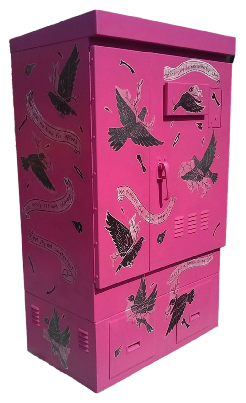 This utility box features racing pigeons, flying among bones and bursting with foliage, embracing the duality of life and death.Utility Box