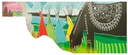 Meguinis’ piece blends modern with tradition using ledger-style, pictographic hide art combined with a nod to anime illustration styles and bright colours.Mural