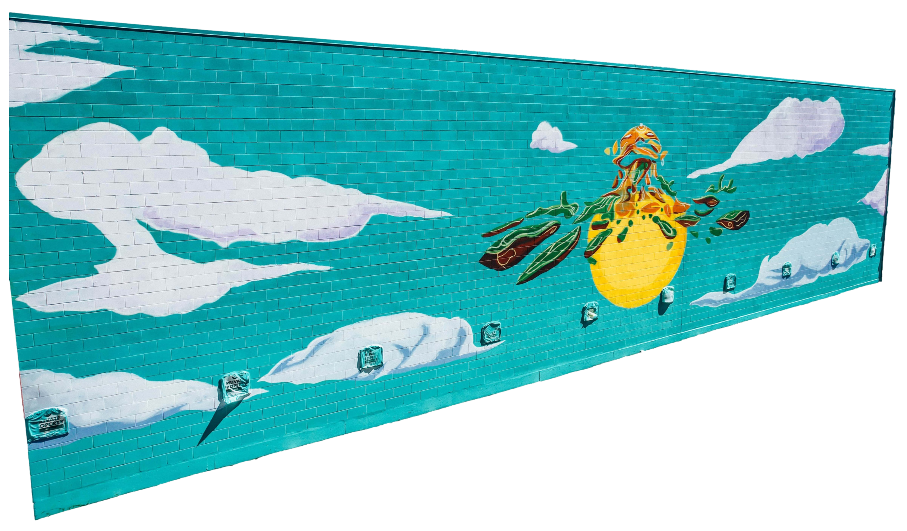 The mural is a forced perspective display of condominium-style birdhouses, with sneaky cats popping up in several spots. A singular little bird is successfully avoiding their daunting hunt, happily placed right in the middle.Mural