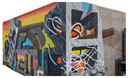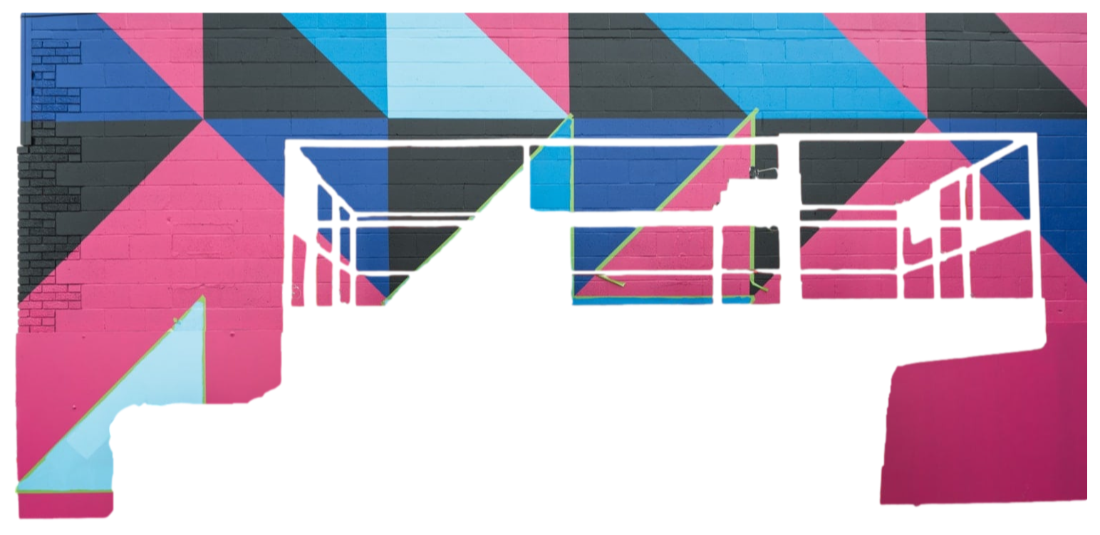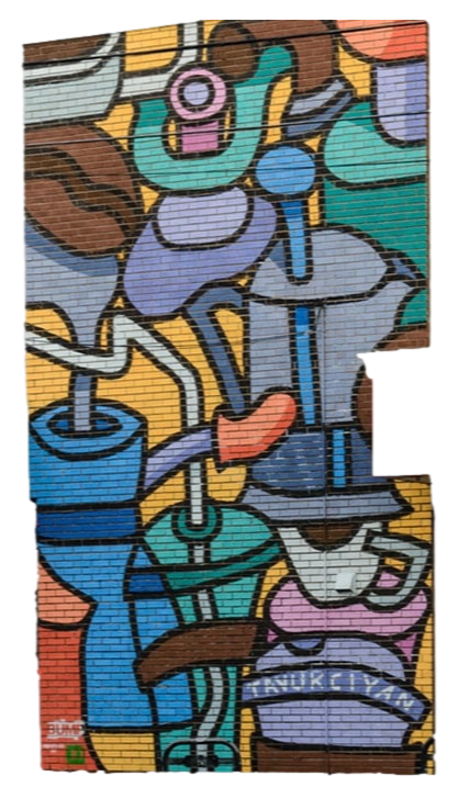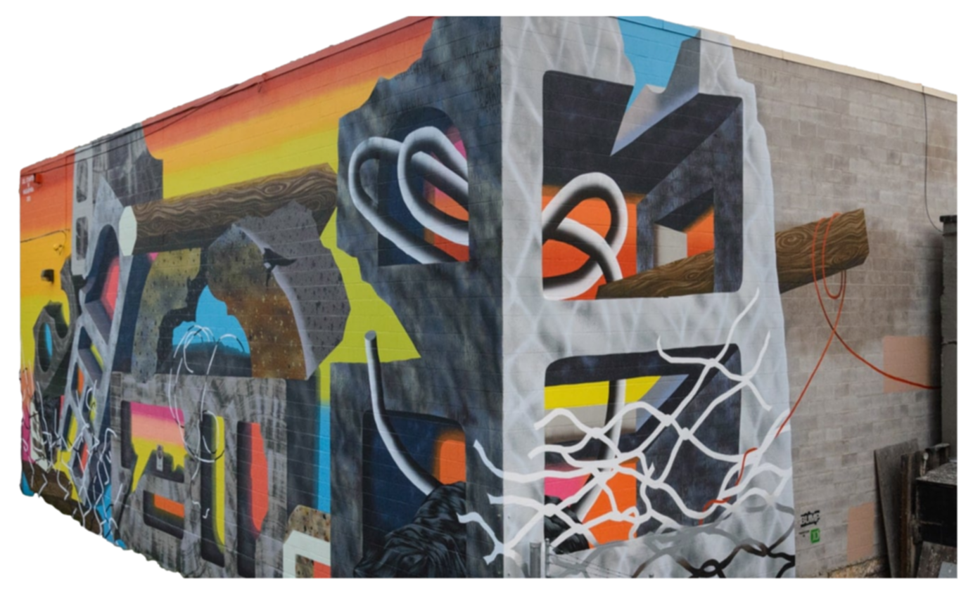 Our approach for the Uptown Bottle Depot mural was to reference and reflect on the surfaces, materials, textures, objects and colours found in downtown alleyways of urban centres.Mural