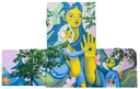 Characters, or “selves'' gaze curiously at each other and at an audience who greets them. Some appear like spirits or soul bodies peeking through lush foliage, or giants gently watching over their neighbours.Mural