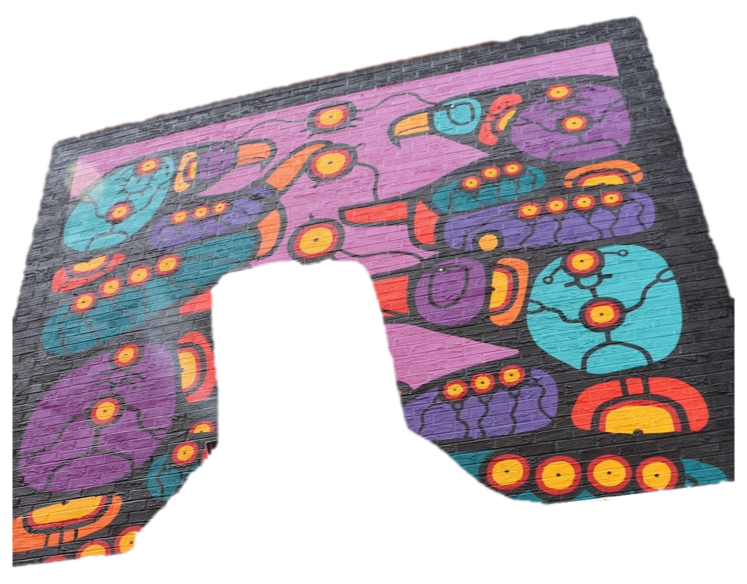 This is a piece that speaks towards the history of the residential school system and powerfully depicts the survival and strength of Indigenous people, even through historical violence.Mural