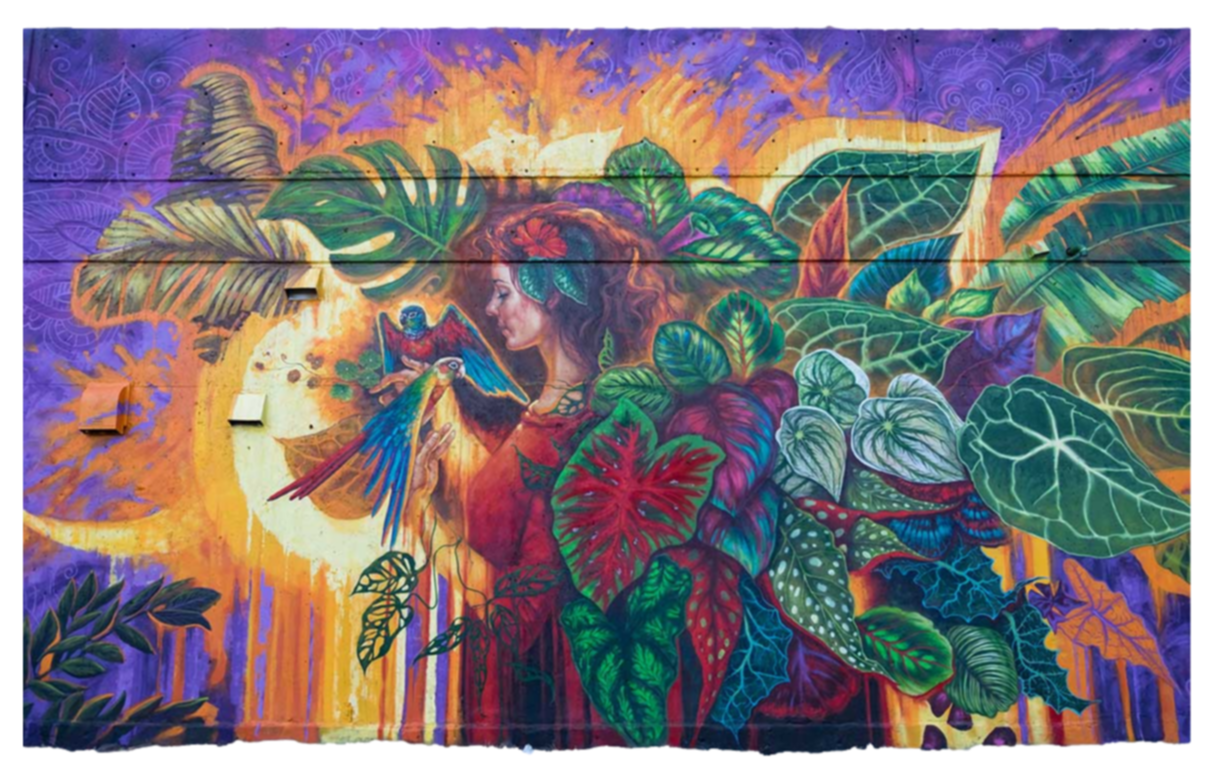 The woman on the mural represents Mother Nature, with huge wings behind her back made out of plants. She talks to the birds sitting on her hands.Mural