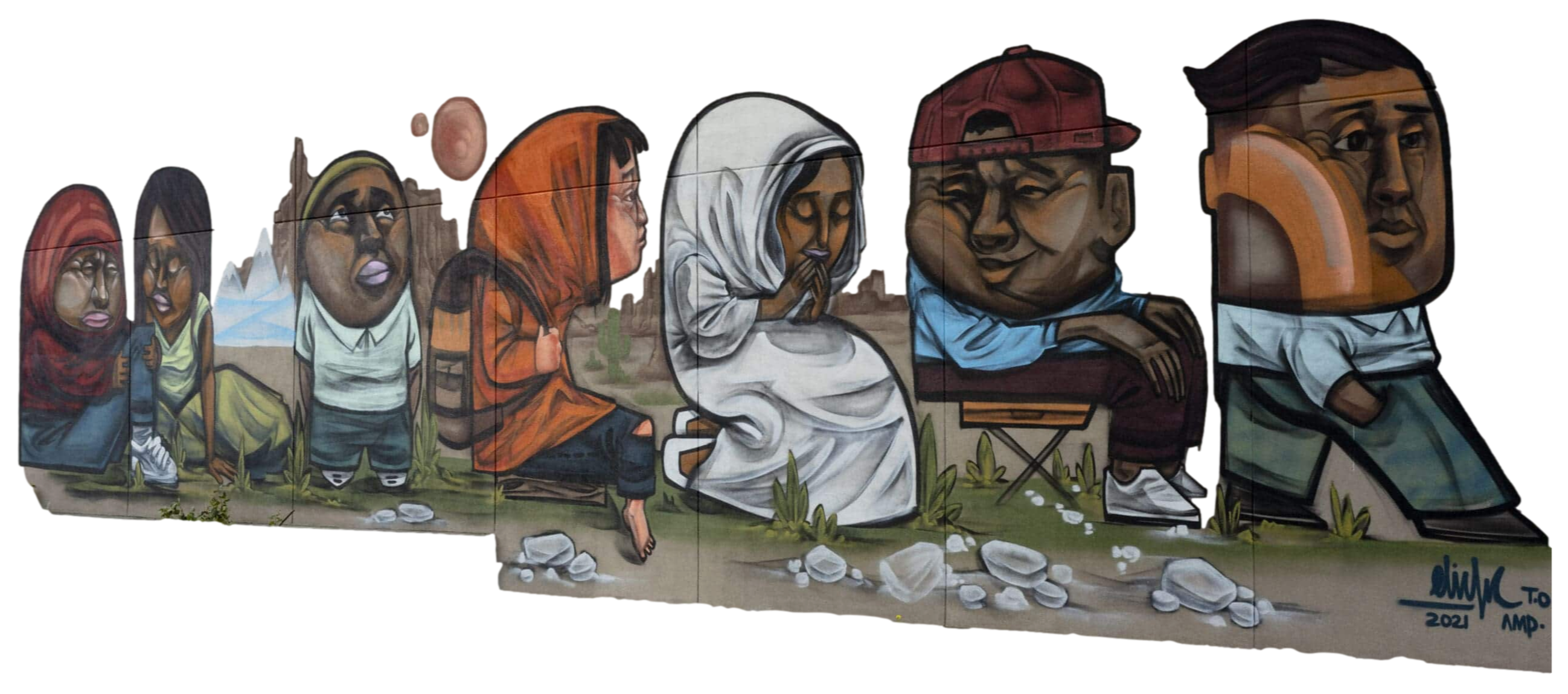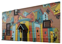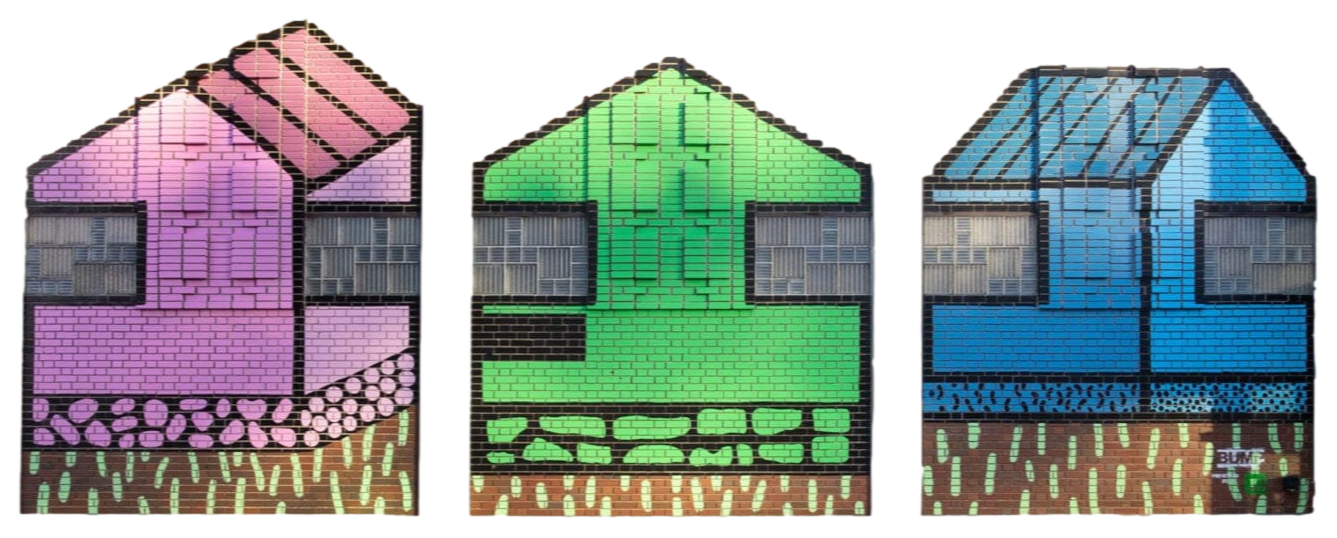 Colourful houses adorn the wall to remind us of the feeling of home; a place where we feel safe, comfortable, and welcome.Mural