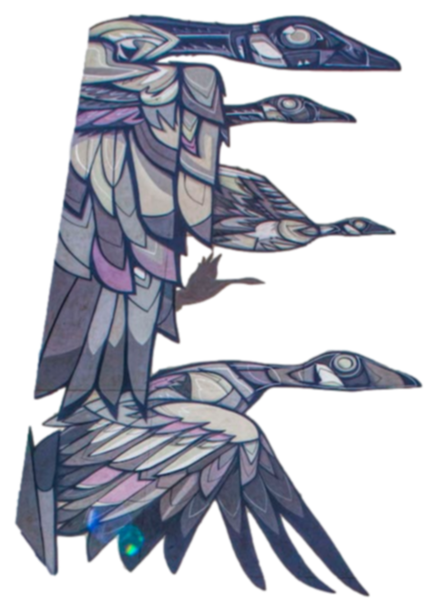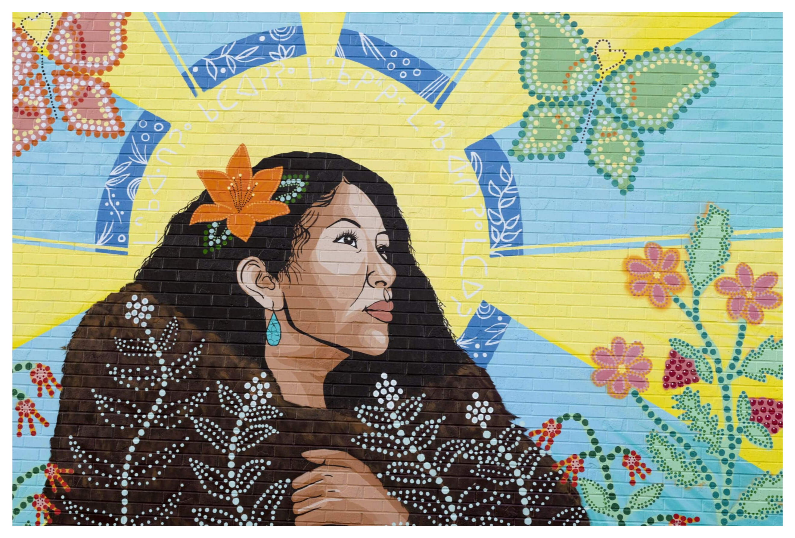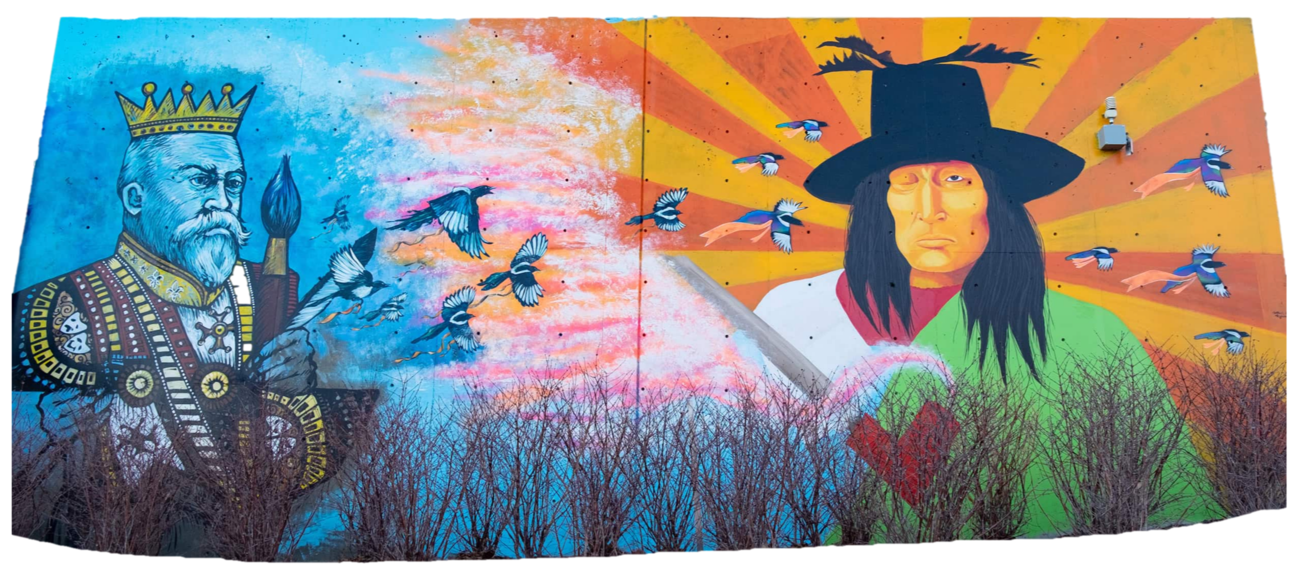 The magpies flying with orange ribbons symbolize them bringing the little ones home who were lost from the residential schools system, and also remembering the ones that survived.Mural