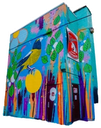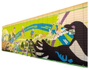 This design meshes floral imagery referencing the artist's Dene heritage with an original image of the Evening Grosbeak, a local bird, to create a dynamic, fun and expressive artwork.Mural