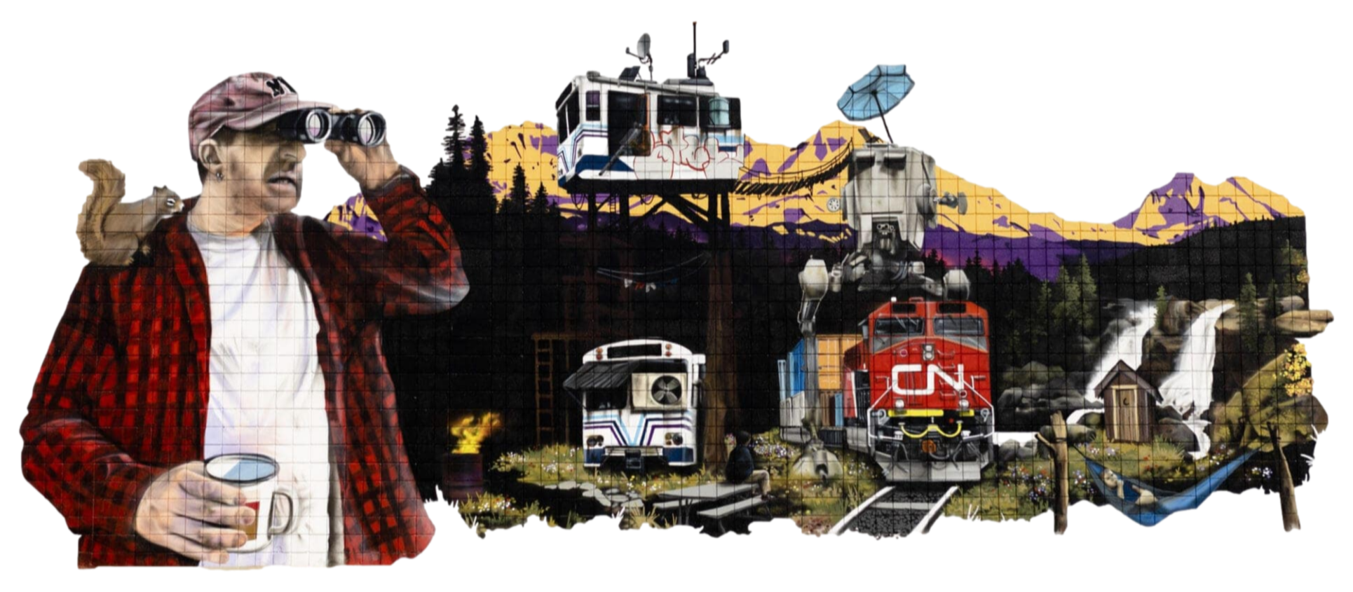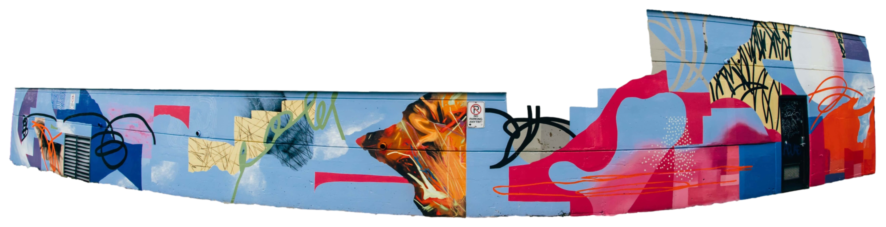 Different elements and aspects of the city of Calgary and the region appear, a mixture of cultures and symbols, of forms of buildings that show its industrial side, and other forms that represent the vast nature in its landscapes such as the Canadian Badlands, the Pine Forest, the Canadian Rockies.MuralGraffiti