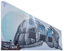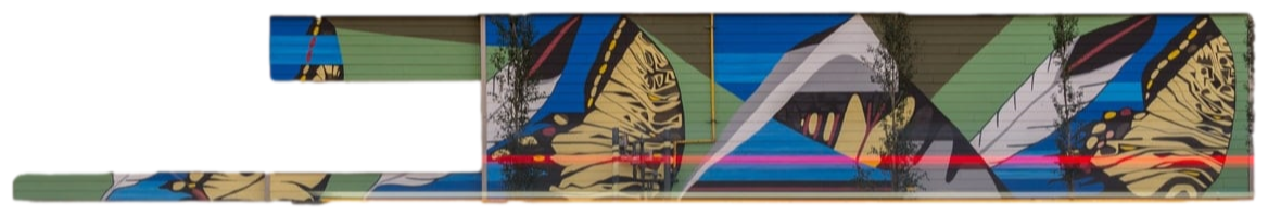 The murals are painted on the abutment supporting the flyover, as well as 3 pillars that support it, representing people moving through their city with visual storytelling that highlights Calgary geography, landmarks and architecture.Mural