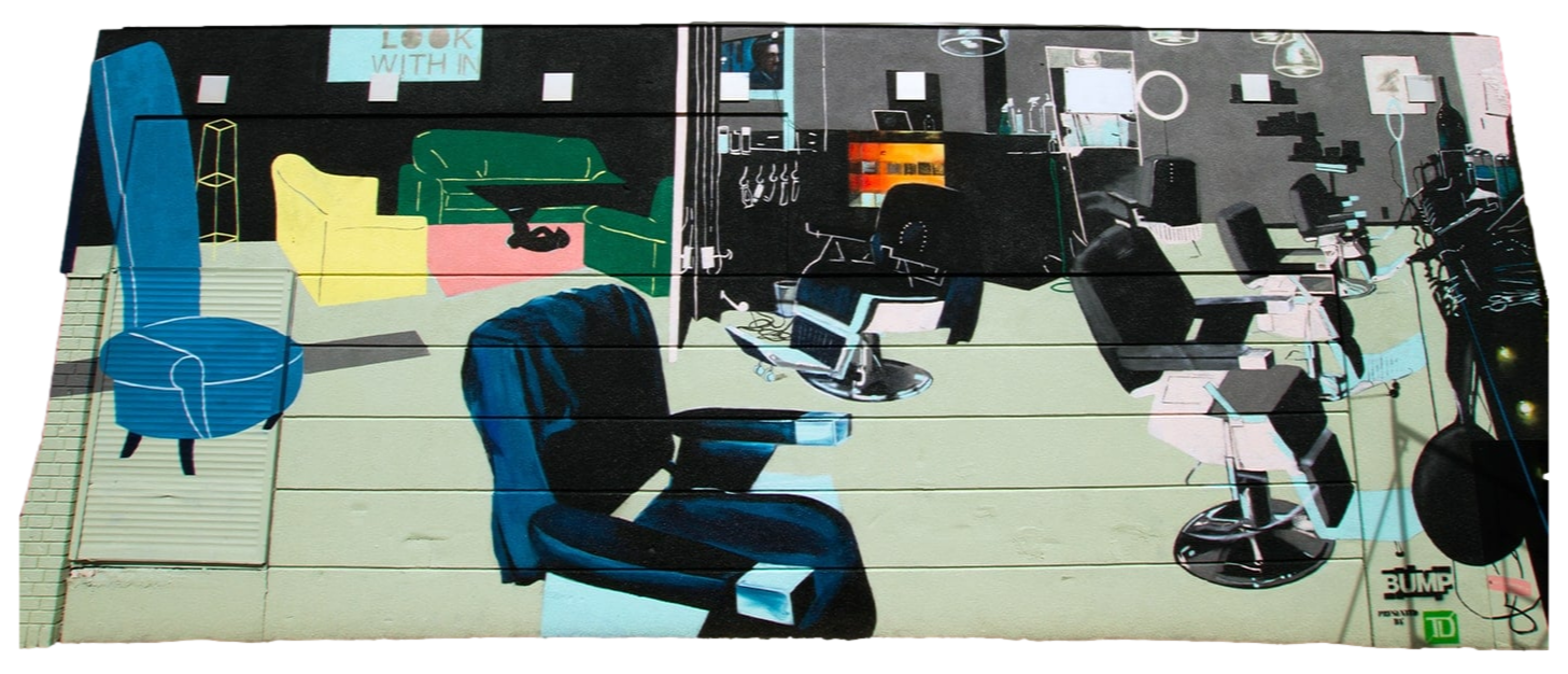 The title Look Within is literal in the sense of seeing something exposed from inside out, as the design depicts the inside of the Barber Culture Shop on their outside wall.Mural