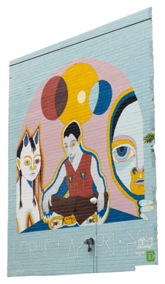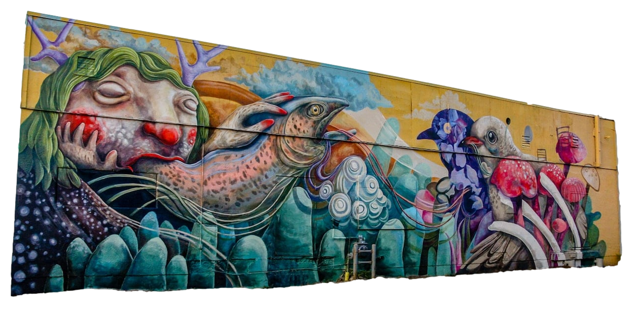 A mural that took 14 days to paint, Pandora’s Snail looks like a page from a timeless storybook you could get lost in. Rich blues and pink adorn the cerebral clowns on Kayla’s canvas, between whom sits an ancient snail. What secret’s loom inside this snail?Mural