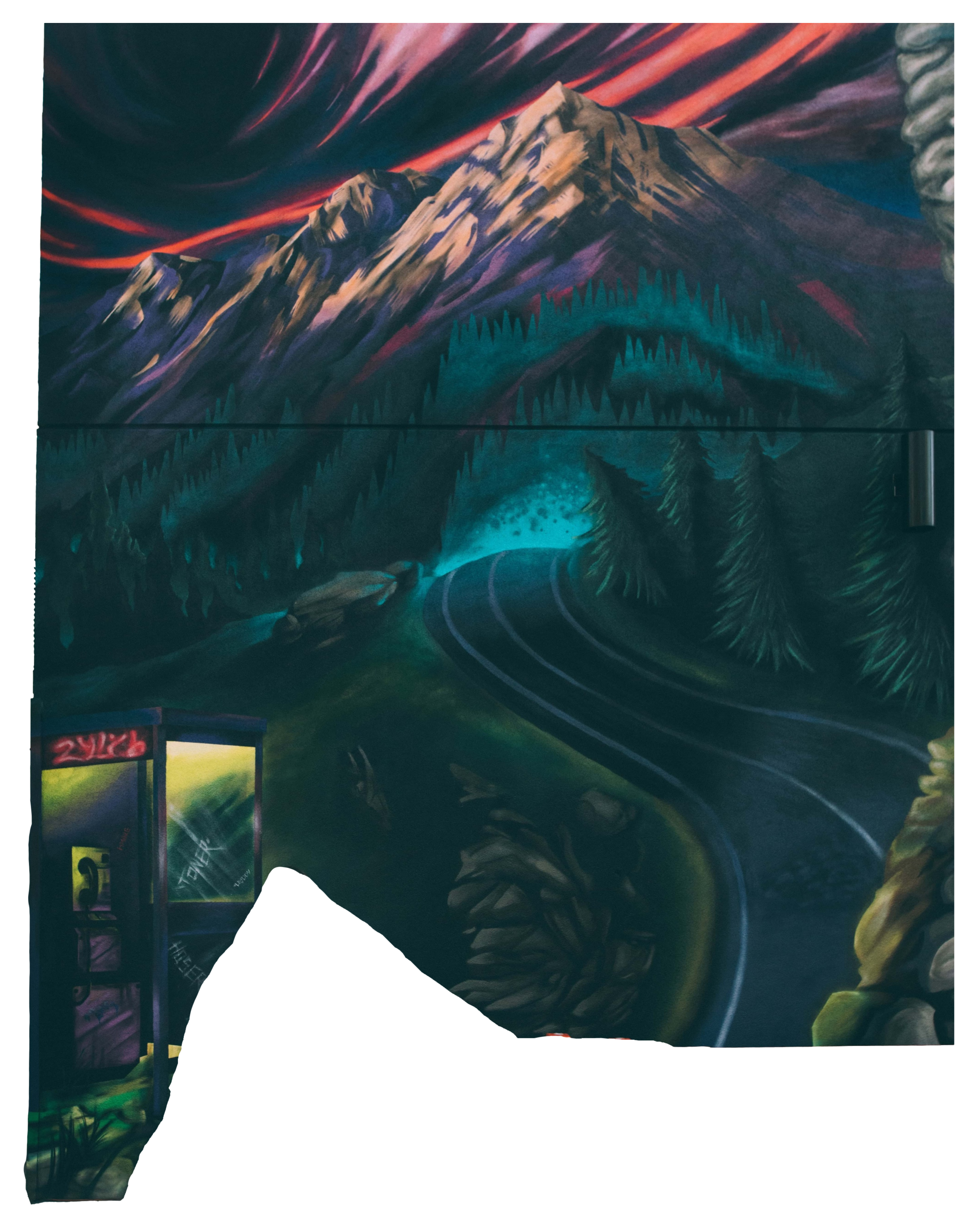 This work showcases Ha Ling peak & Miners peak from the East end of Rundle, with a thick blanket of clouds covering the valley below, creating a feeling of extreme elevation.MuralGraffiti
