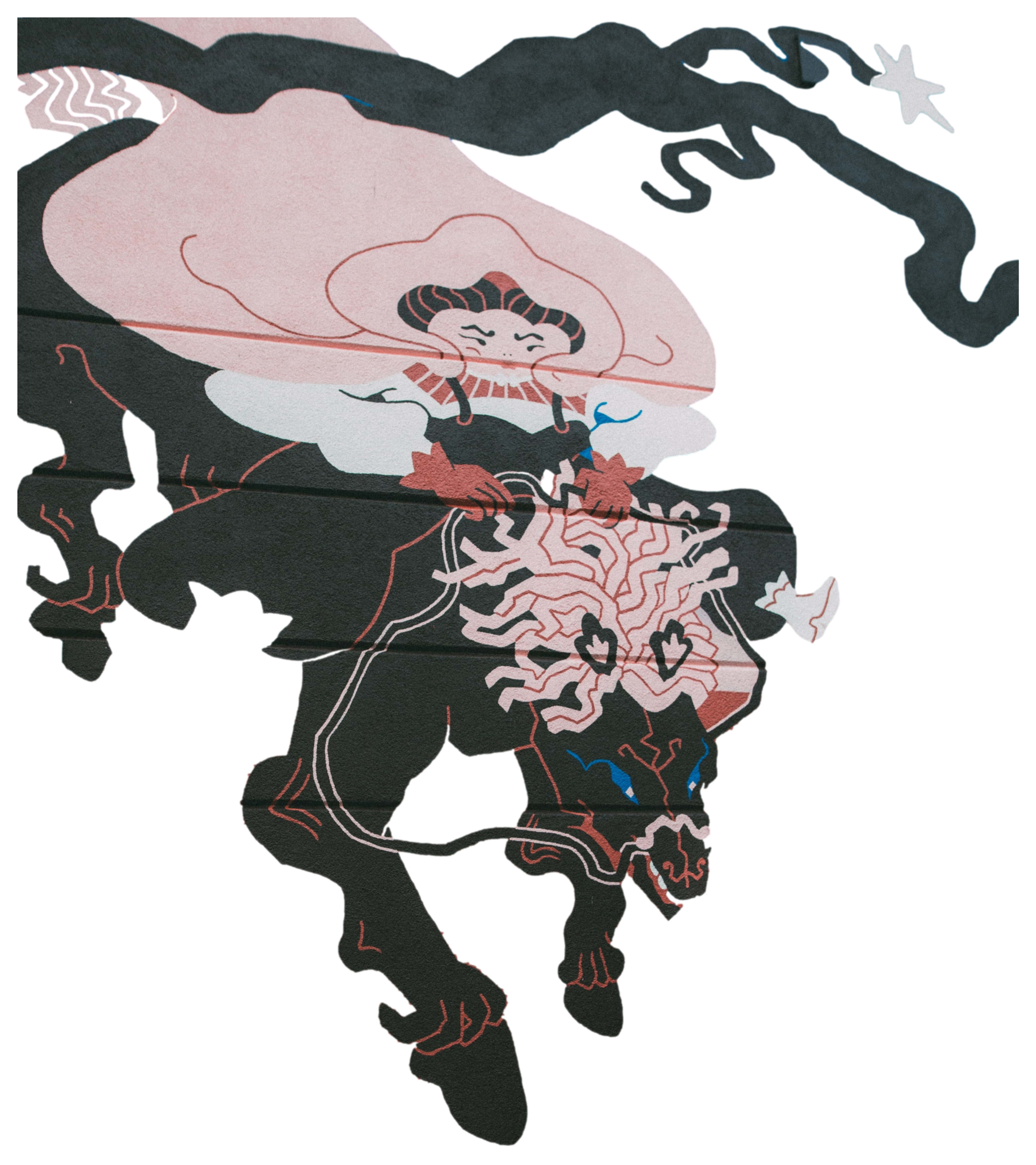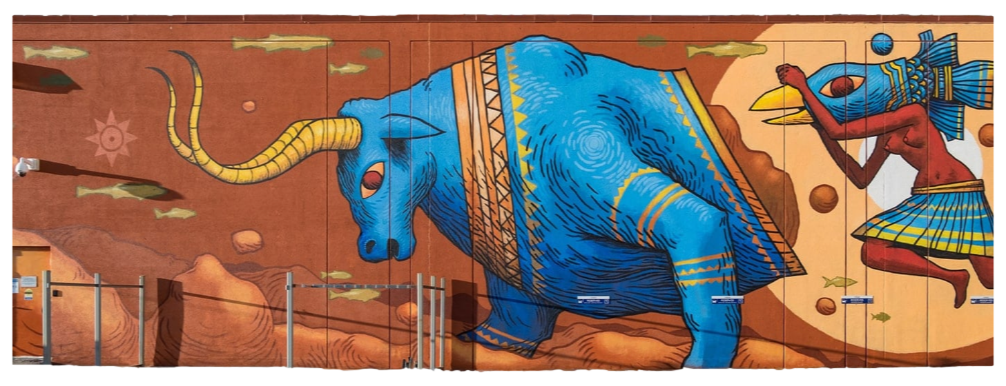 This bull and this masked woman are part of the same cycle, they are unified, they are life and death, fertility and desert. They are opposite and the same.Mural