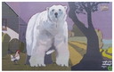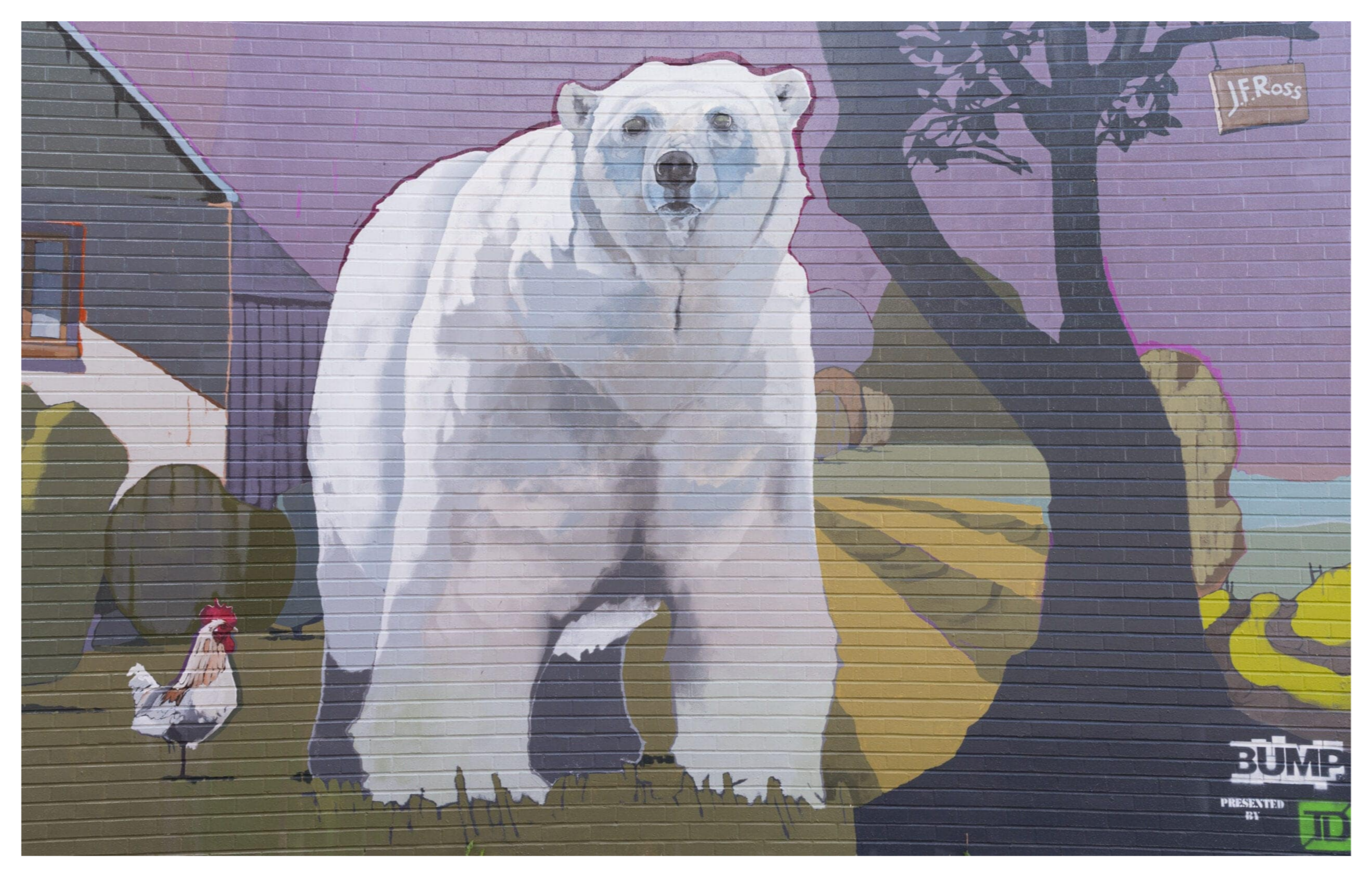 This whimsical and exaggerated image of a polar bear in a pastoral country scene intends to foster dialogue about habitat displacement.Mural