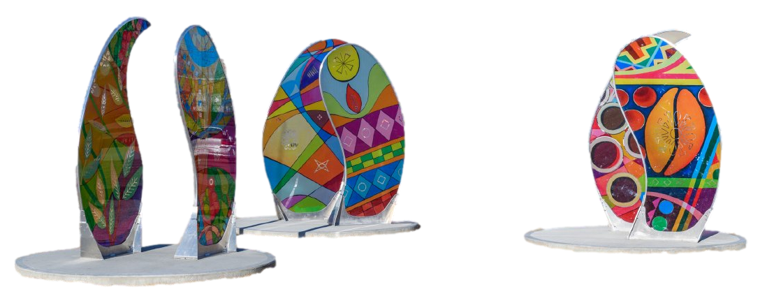 You can take shelter from the wind thanks to three structural wind blocking pieces. These wind shields celebrate nature and represent Ethiopian and Ukrainian cultural symbolism in the form of coffee bean and egg shapes.