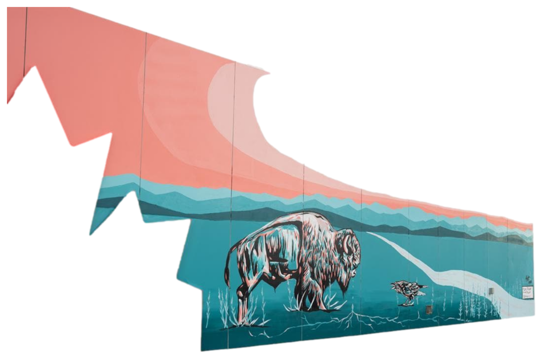 The artist included prairie grass (Buffalo grass/sage) in the mural, something that is regionally present here in Alberta, and would be something that the buffalo would eat to survive.