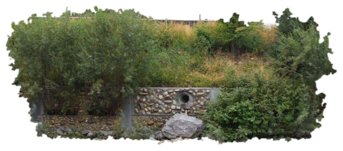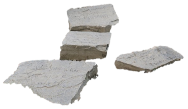 In summer, this normally dry stream flows with water and these large stones provide a pathway across. Engraved on five of these stones are phrases in Inuvialuktun and English that are personal to the artist.
