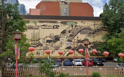 This piece reinterprets a historical Chinese painting with nods to Calgary’s Chinatown.