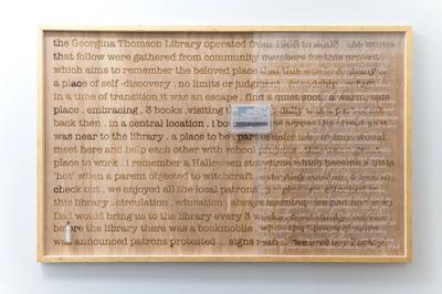 Kari Woo developed her public art project to purposefully bridge the former use of the site with its new purpose as a neighbourhood services office. Working alongside the local community and the family and friends of the late Georgina Thomson, she encouraged the exploration of the piece and its use in the new context to develop two installations that celebrate the site's past and present. The interior installation features a collection of collages, inspired by items collected during a workshop, which invited Calgarians to tell the story of the building and the woman it was named after.