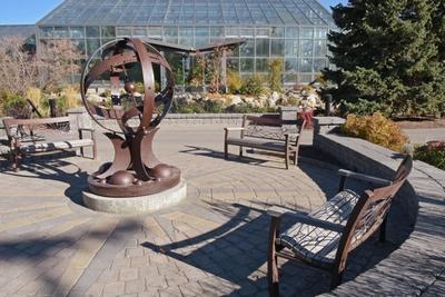 The artist who made this work describes it as 'a teaching tool to explain the movement of the sun and the construction of time.' Surrounded by benches that represent each of the four seasons, this installation encourages the viewer to think about growing cycles and the passage of time. This sphere was a gift to the people of Calgary from the Calgary Horticultural Society in celebration of its 100th anniversary in 2008.