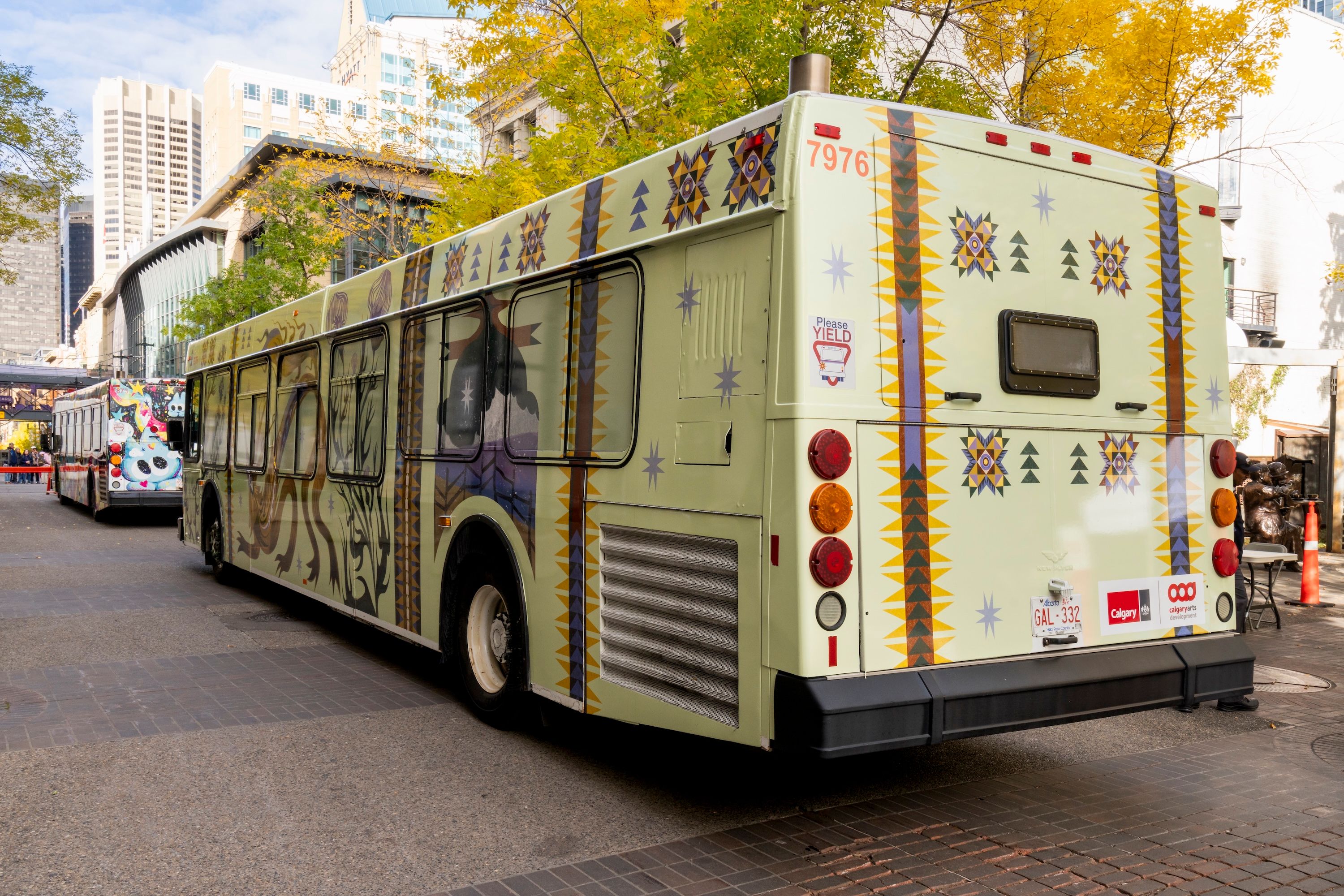 This project for the Calgary Art Buses has a central theme featuring a Hare and a Coyote on opposite sides of the bus, symbolizing the harmonious relationship between these animals.
