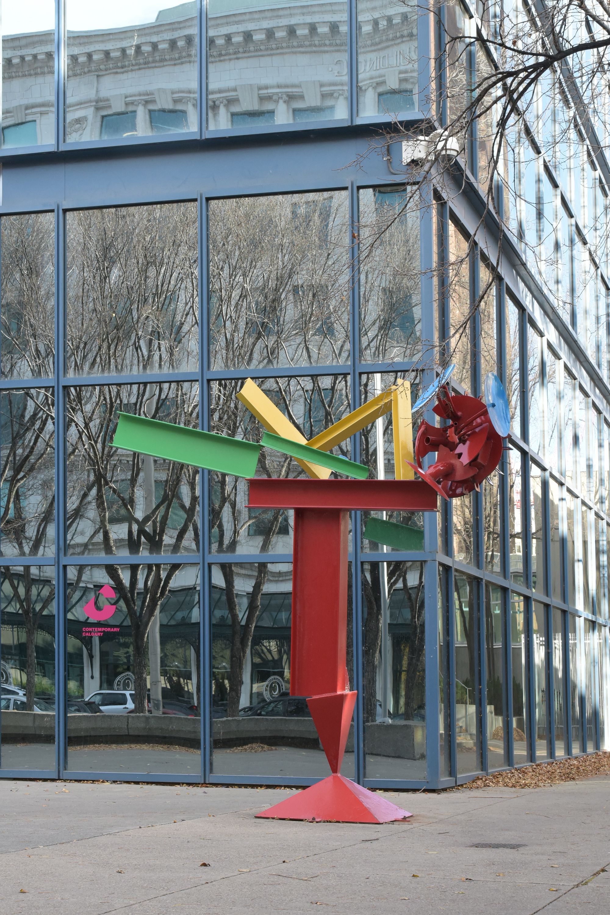 Like a brilliantly coloured industrial "tree", its red trunk is perched precariously on a single tapered point. Above, three discs scan the sky like whimsical satellite dishes. The vertical post is topped by a horizontal beam from which yellow and green I-beams soar up and away, creating an upward motion that counters the gravity-defying balancing act at the base of the structure.
