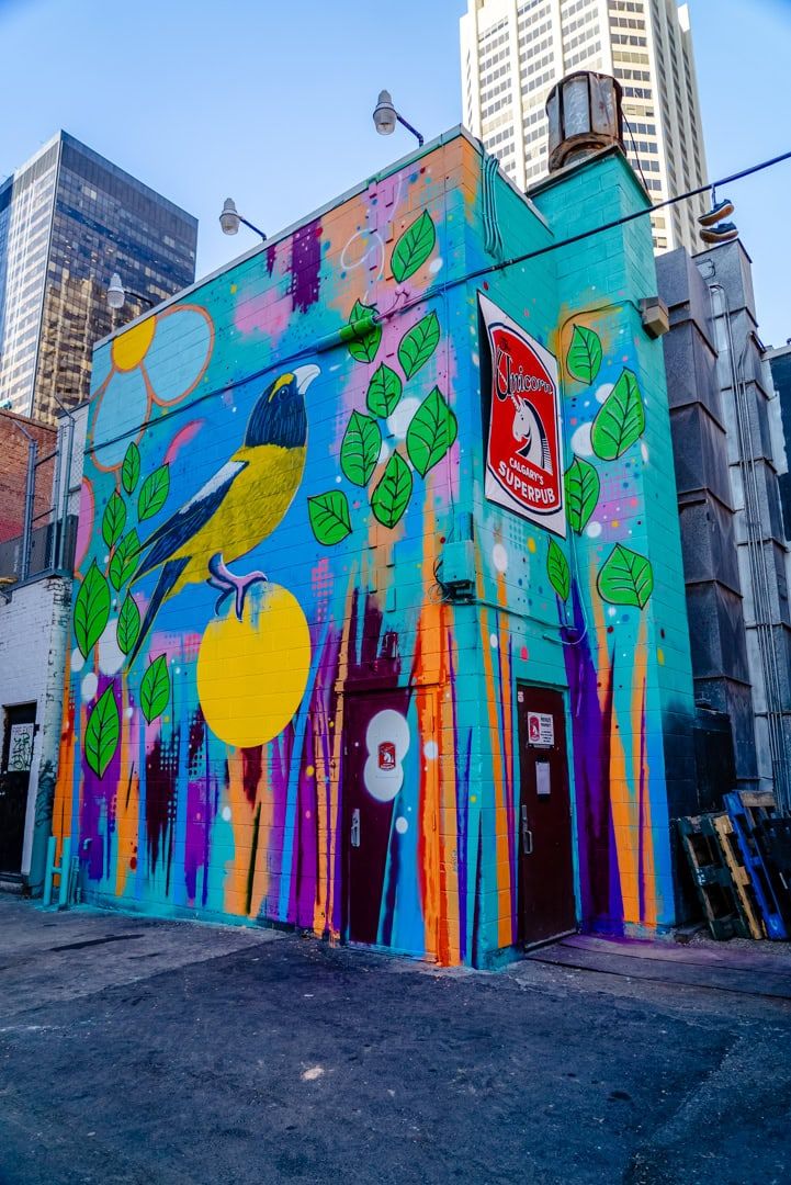 This design is rooted in my painting practice, meshing the floral imagery that reference my Dene heritage, with an original image of the Evening Grosbeak, a local bird, to create a dynamic, fun and expressive artwork. The Evening Grosbeak is a splashy finch of northern coniferous forests and year-round resident of the foothills (I took the original photo myself at Brown-Lowery Provincial Park southwest of the city). The leaves, flowers and background colouring represent the natural environment, and hint at sunshine filtering through the trees. The bird is perched on a yellow circle representing the summer breeding season, or the circle of life, while the yellow center of the flower in the top left also represents the summer sun. The floral element might seem to be a simple design, but it is nevertheless a strong and recurring theme in Dene visual arts. Here, my intent is not to foreground my culture but to inform the work with the artist’s practice. At this stage, this digital concept is a vision only, and requires sizing to the exact dimensions of the building. The main foreground elements of design and colour theme would of course remain, and the background, applied using spray gun and wet brushes & rollers, will produce a similar gritty layered effect. The concept for the wrap-around walls to the right of the main wall is to continue this background layering with leaf motifs, allowing for and giving space to existing signage, and incorporating white and red into the wall with the sign.