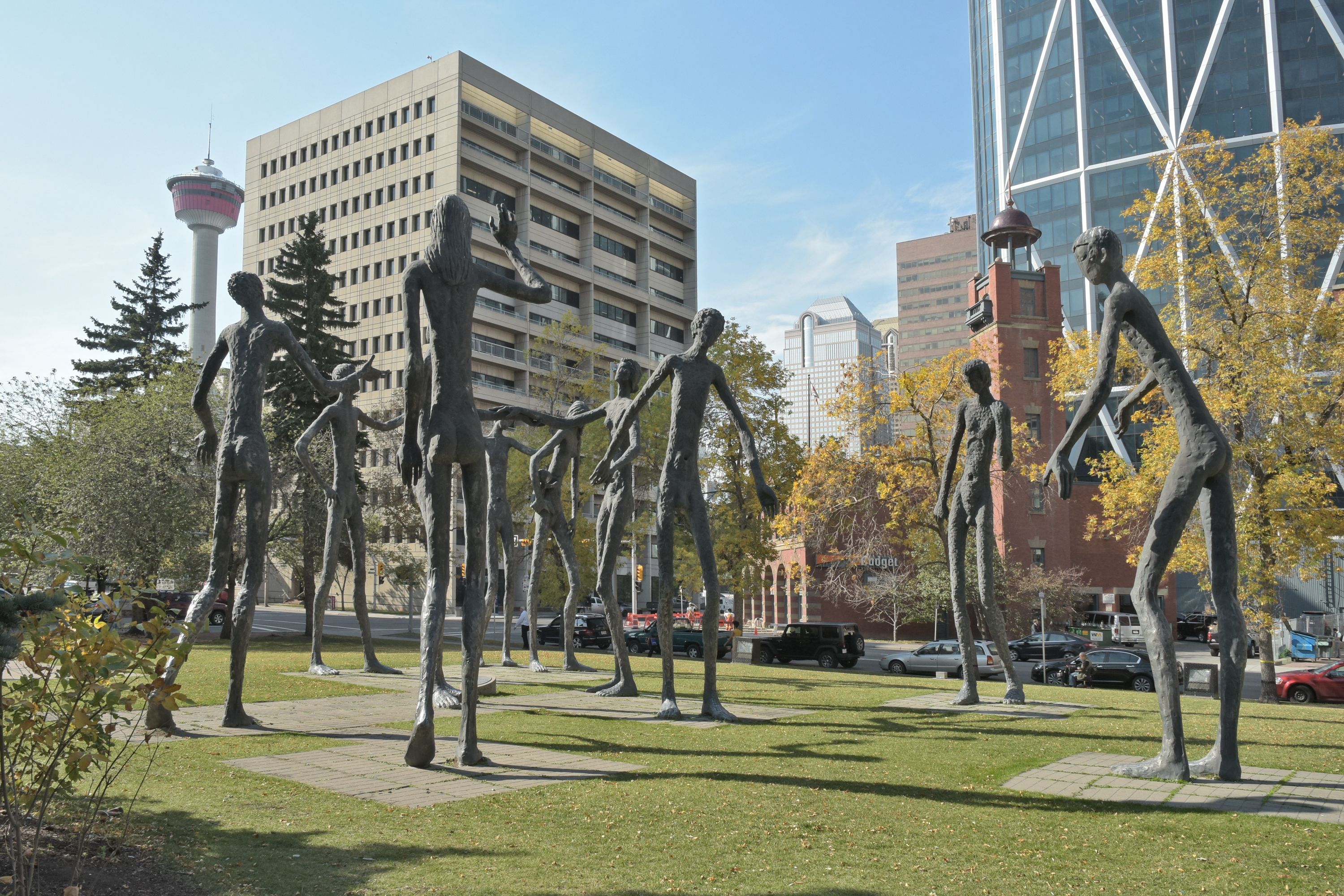 Devoid of all social markers of individuality, race or class, the male and female figures embody all humanity as they interact. In two groups, outstretched arms and linked hands create physical and metaphoric bridges. Other figures face them, including a mother with a child. Disturbing to many in 1967, the statues are now a popular landmark, known as The Family of Man.