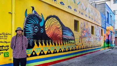 The Buffalo with the Camp and simple landscape represents all the Buffalo Nations that hunted and lived off the Buffalo. The dragonflies represents the month of August and also I wanted to tie the Beltline mural project with it…. during August and late July the dragonflies are in full effect and is good to help time the changes in the seasons. Under them are traditional otter designs which are common design in Treaty7 territory. The riders are youth and elder riding together representing parenting, mentoring, and the balance.