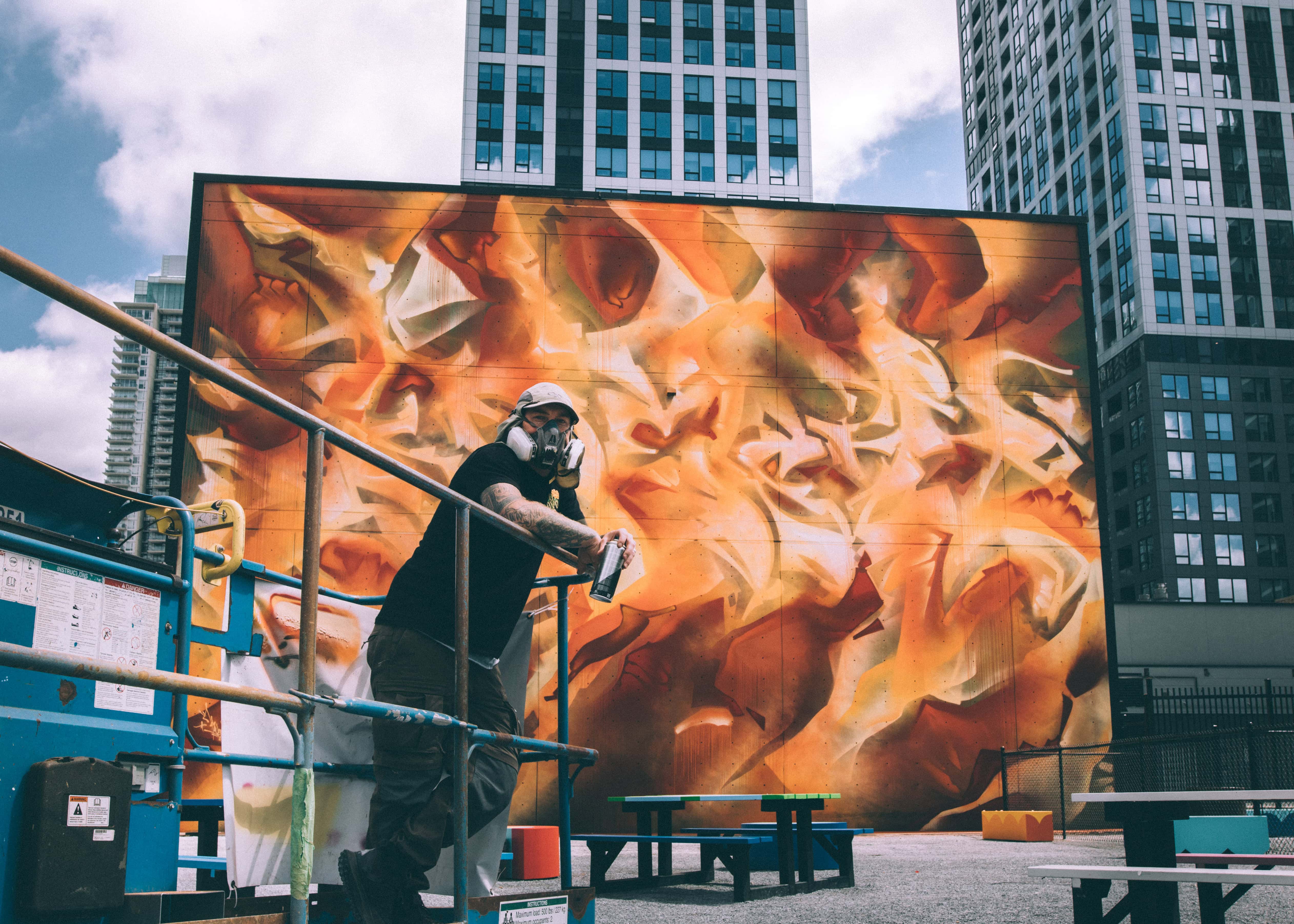In this vein, Kwest proposes an innovative approach involving an abstraction of wild style lettering for the mural design. The aim was to capture the essence of a Calgary sunrise in the Macleod Trail mural, Kwest translates his interpretation of this impressive display of nature in his signature abstract style.