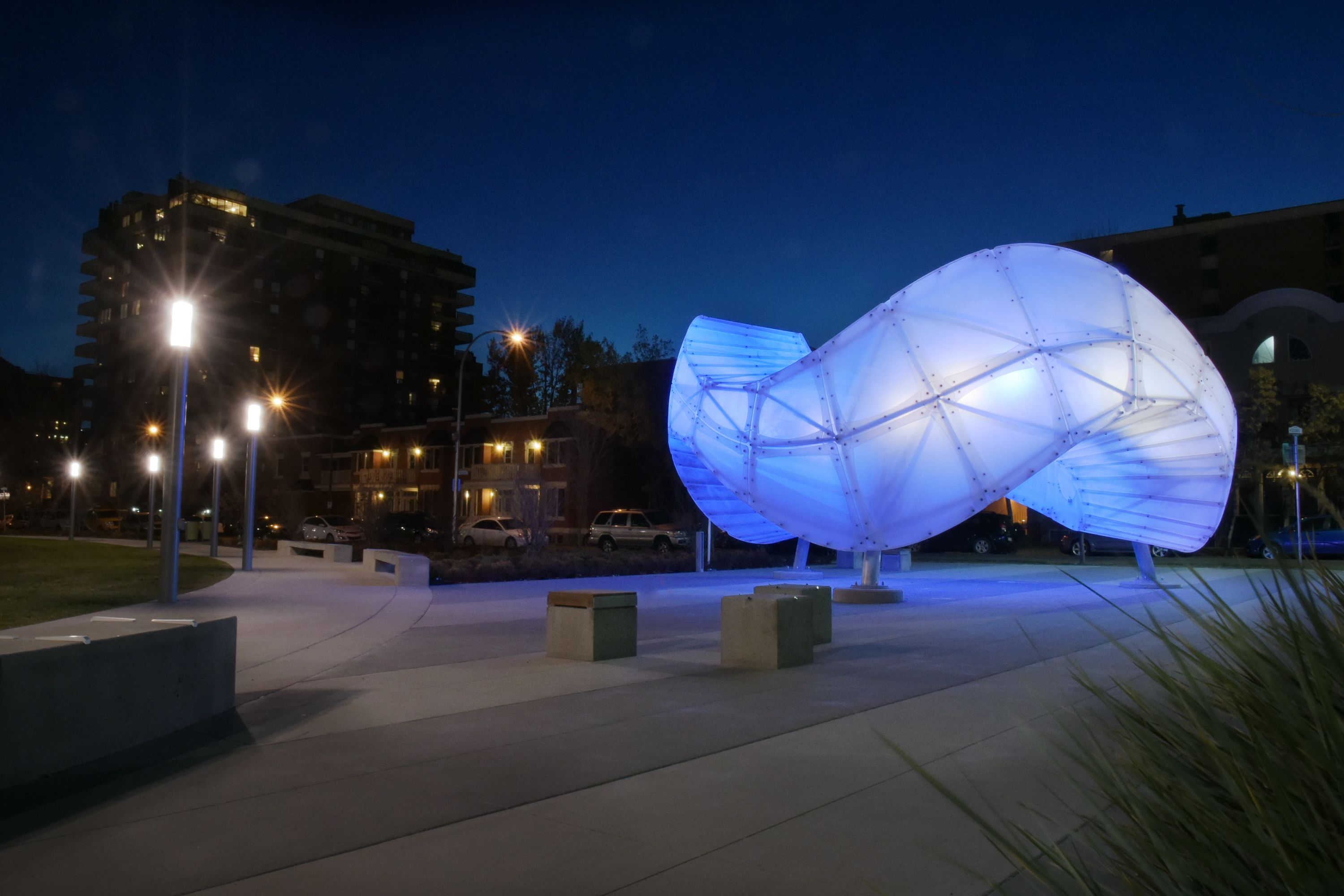 Illuminated at night, visitors have complete control over the lighting of the sculpture through an optical sensor that projects the movements and colors it sees onto the artwork's surface. Wave your hands, move colored objects or play a movie from your cell phone and witness the unique light sequence that takes shape. Here is a video with more information on this project.