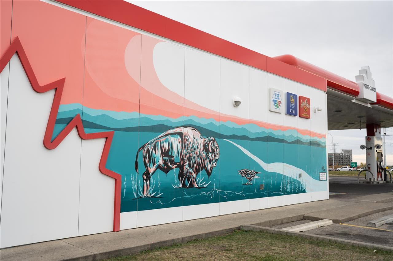 The buffalo and the raven are like a cycle – a cycle of growth and change that have existed in the natural world forever – and the connection between the Creator, the earth, the water and the spirit. I have included the prairie grass (Buffalo grass/sage) in the mural, something that is regionally present here in Alberta, and would be something that the buffalo would eat to survive.