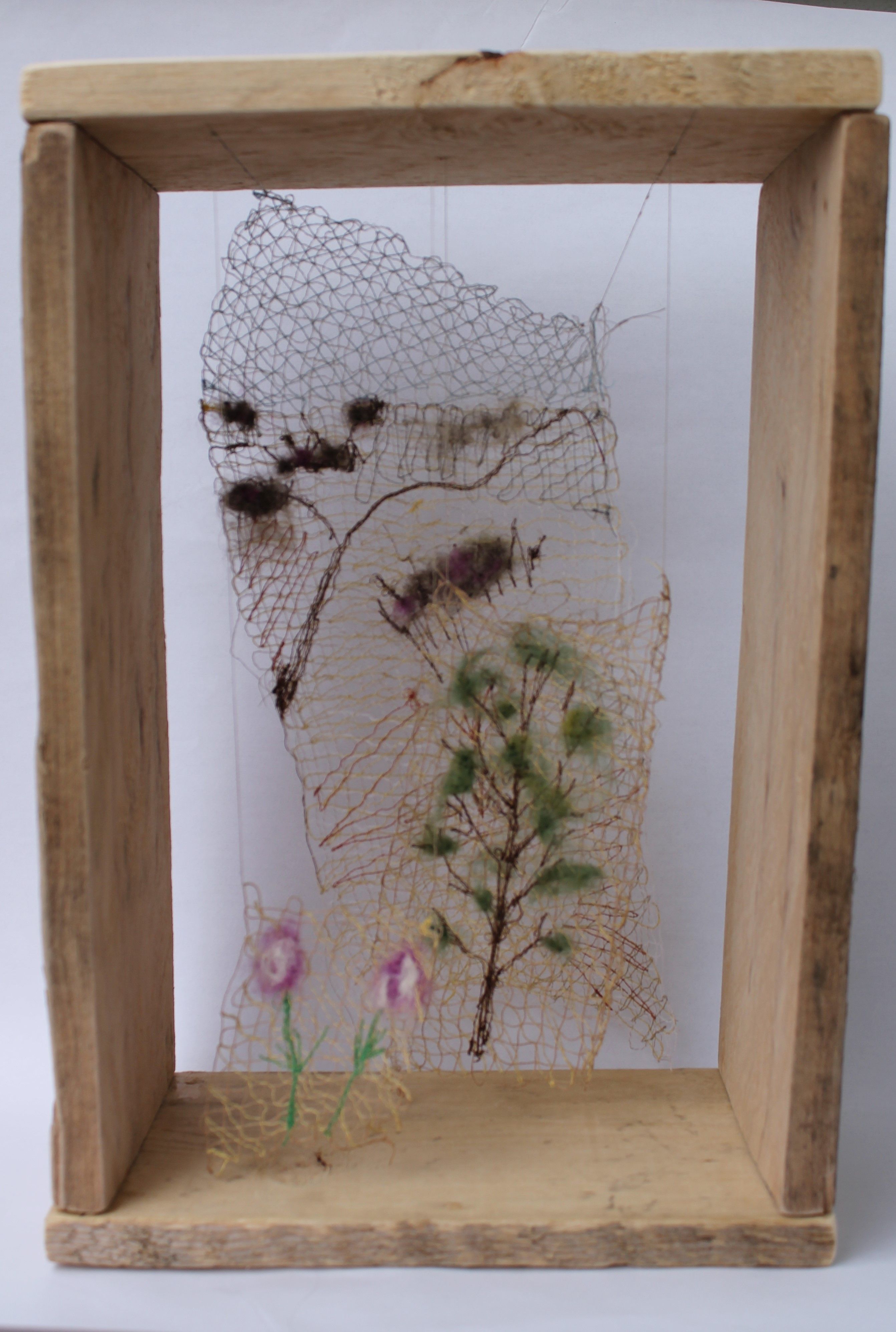 Through my artwork, Connection Through the Land, I used threads of many colours, duplicating the colour palette of Nose Hill Park in early spring. The horizon line in this artwork hints at the vegetation seen on Nose Hill and a pathway created by those who have enjoyed this park through the years. The landscape created through threads is also fragile looking, reminding us that we must be responsible stewards of these spaces. The layers of this artwork are reminiscent of sediment layers or tree rings, showing the passage of time. Like a land acknowledgement, a sense of gratitude is expressed for the stewards who have lived, worked and played on this land before us. The opportunity to enjoy spaces like Nose Hill Park exists because of those who lived before us and took care of them.