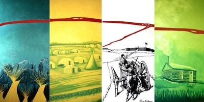 These panels draw numerous elements together; we celebrate history, cultures, and community through their creation. The colours of the panels--red, blue, green, and white--have cultural significance and were inspired by the Metis sash.