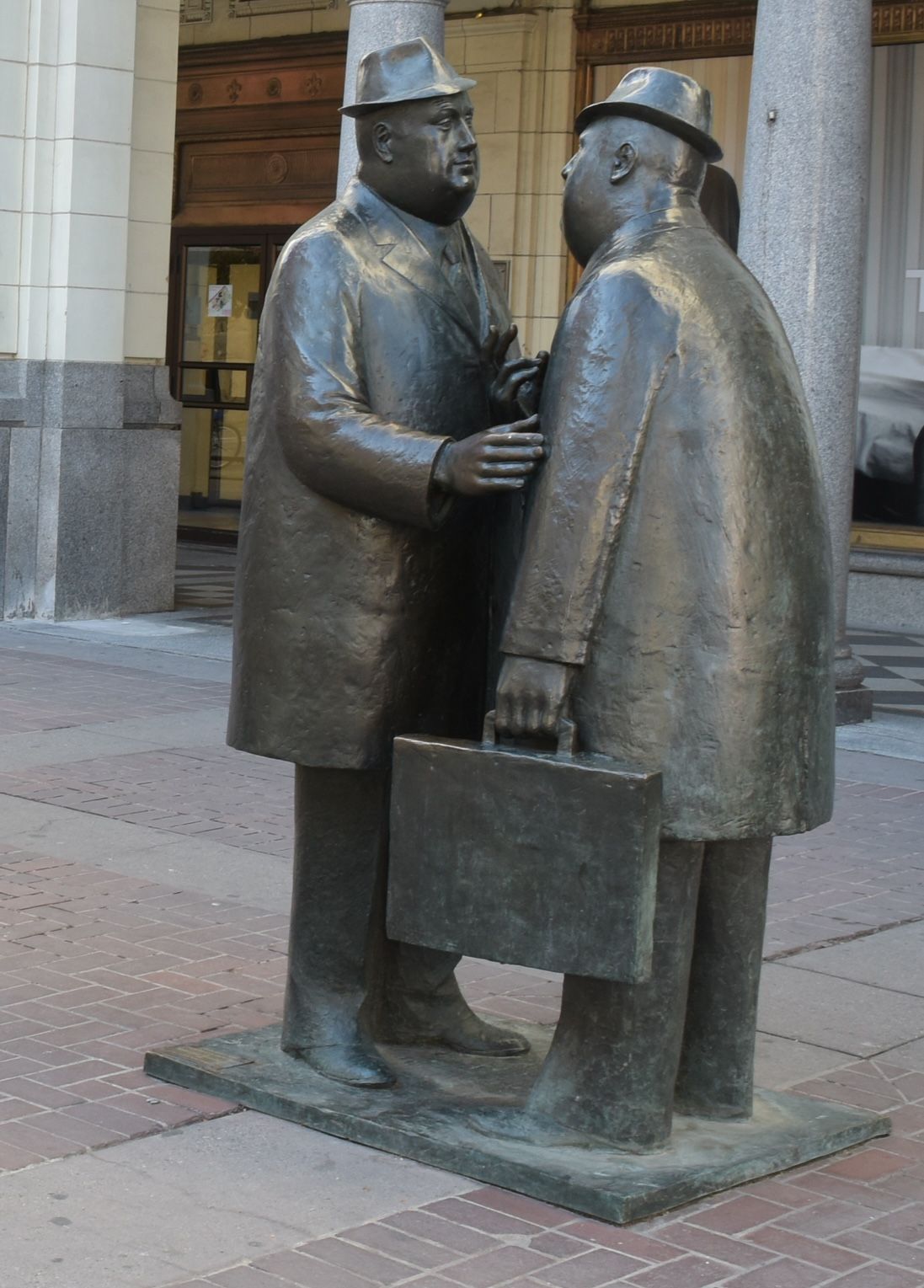 Here, two businessmen, recognizable by their clothing and briefcases, are intently focused on each other. Their exchange seems more pointed than amicable. Leaning forward as he speaks, one man gestures emphatically, while his calm colleague tries to reassure him with a gentle touch to his arm.