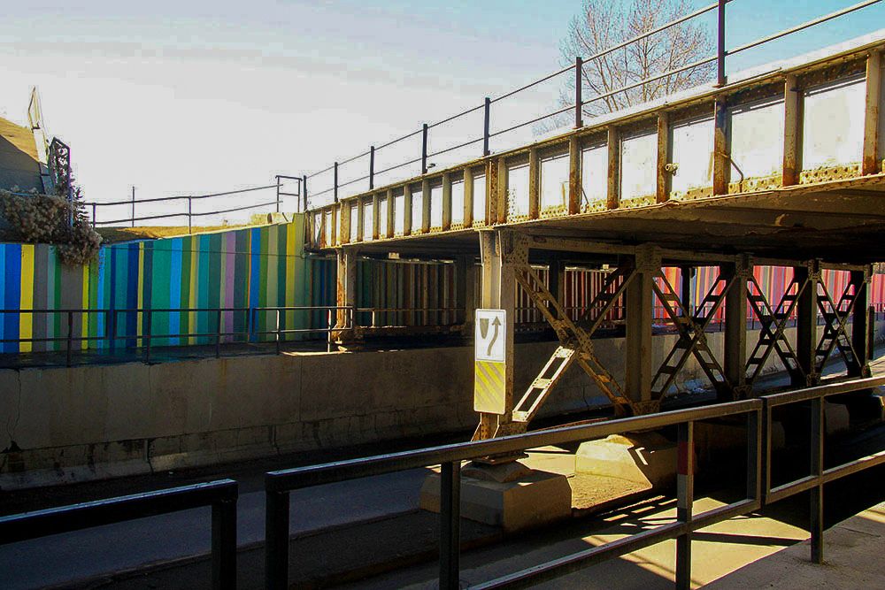 This was a collaborative mural project set in Inglewood. We started the conversation with the Inglewood BRZ with the purpose of rejuvenating a section of the Blackfoot Trail underpass that pedestrians found dark and foreboding. The work helped to redefine a forgotten space through the manipulation of texture, colour and form. The journey along the underpass begins with vertical bars of colour, painted directly onto the concrete abutment. The lenticular colour scheme flows over corrugated forms of plywood and various materials salvaged from the Inglewood Community, becoming an amalgamation of local influences. By incorporating signs, and various recognizable materials amongst the plywood, an aesthetic is created that is unique to the area and has an immediate connection to the community at large. As one continues along their journey, the work presents the illusion of a rippling wall, reminiscent of old train cargo cars. This pattern focuses towards an epicenter, under the CPR bridge, radiating outwards in either direction. Texture and colour eventually dissipate into the concrete wall on either end of the work.