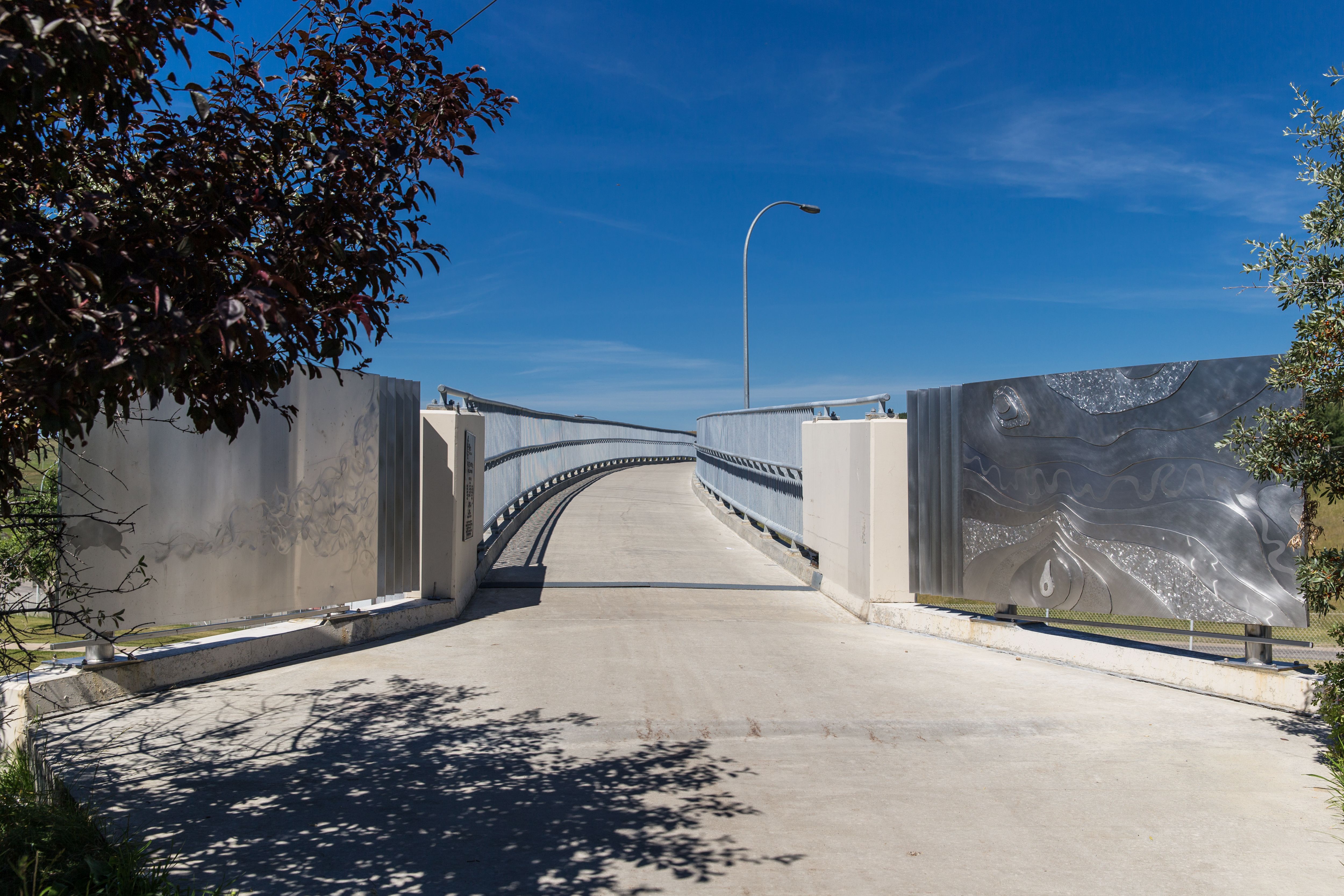 Images relating to the natural environment are featured on these artworks, which welcome and entice the user to explore, investigate and enjoy the natural environment around them. The curvature and patina of the panels were purposefully selected by the artist to echo the architecture of the bridge. Impressions of bison, predators and even a topographical map can be found etched into the artworks' surfaces.