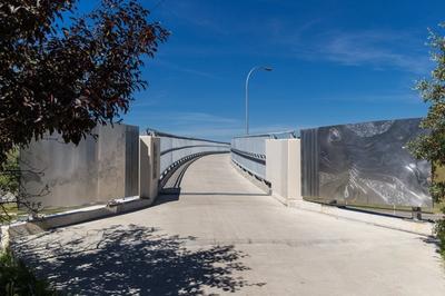 Two sets of curved, steel panels flank either end of the "Whispering Grasses Walkway", a pedestrian overpass leading into Nose Hill Park.