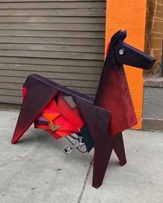 A piece of public art that looks like a horse and will charge your USB device when you pedal it.