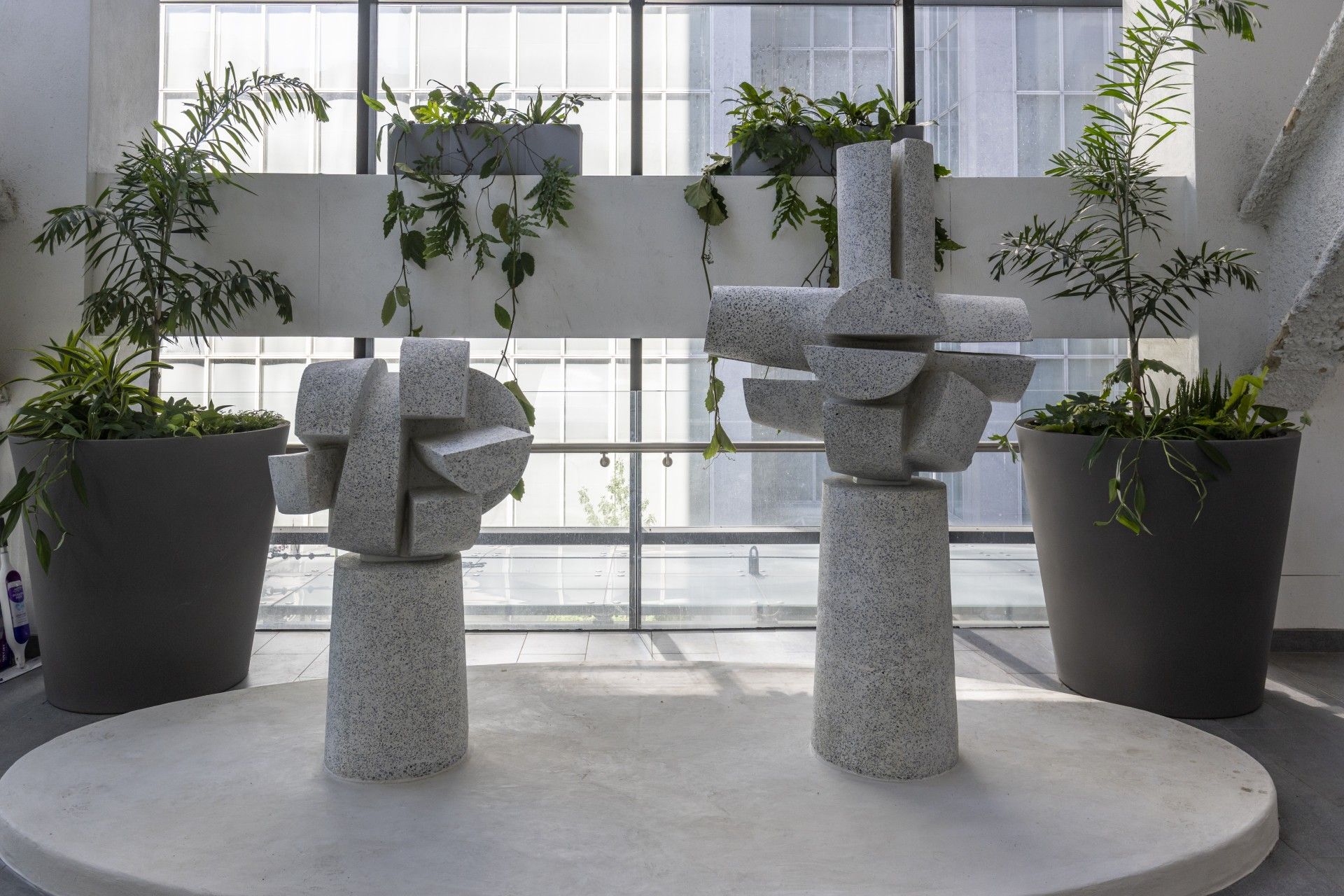As a young artist, chance played a role in her art. When a ceramic pot was accidentally destroyed in the kiln, she was intrigued by the shards. She imaginatively re-united the parts by creating abstract beings, with "heads" set on top of columnar "necks". The bisected elements of the spheres recall the broken vessel that had inspired her.