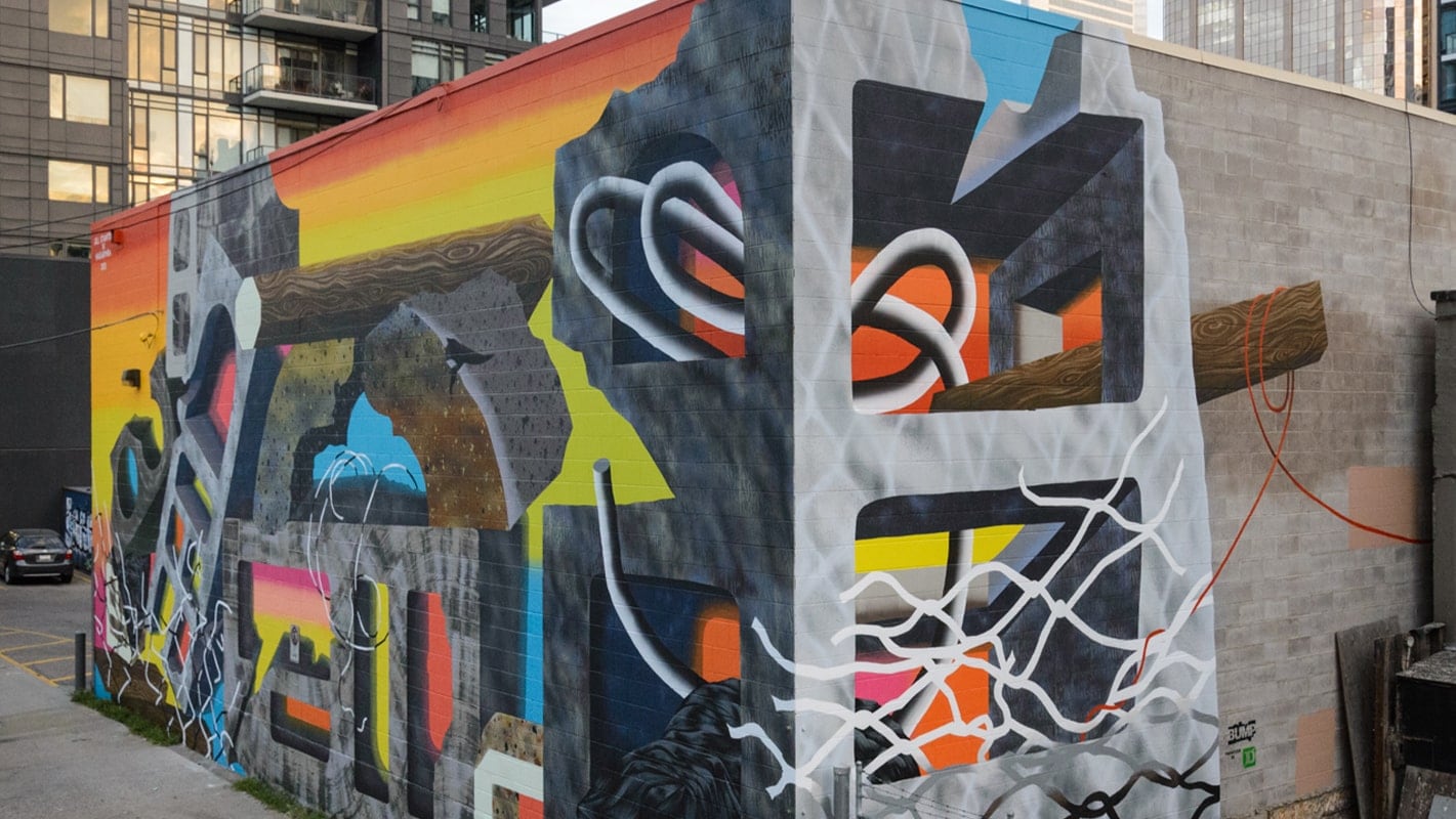 Our approach for the Uptown Bottle Depot mural was to reference and reflect on the surfaces, materials, textures, objects and colours found in downtown alleyways of urban centres.