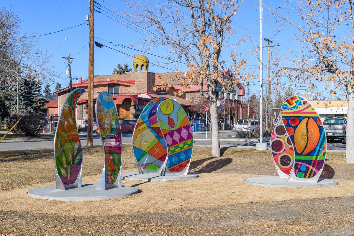 A collaboration between Calgary artists Oksana Kryzhanivska and Sisay Shimeles, the designs for the artwork were conceived during multi-cultural art workshops with Spruce Cliff community members that focused on cross-cultural and traditional ways of art making. With the goal of uniting multicultural artists and building stronger community ties that would highlight Spruce Cliff's identity, participants produced paintings that were incorporated into the final art pieces. Iconic references from the artists' cultural background, the coffee bean and egg shape, frame transparent collages of the artists' work and community members' paintings. Viewers are encouraged to stand at different places in the area and witness the half shapes becoming full.