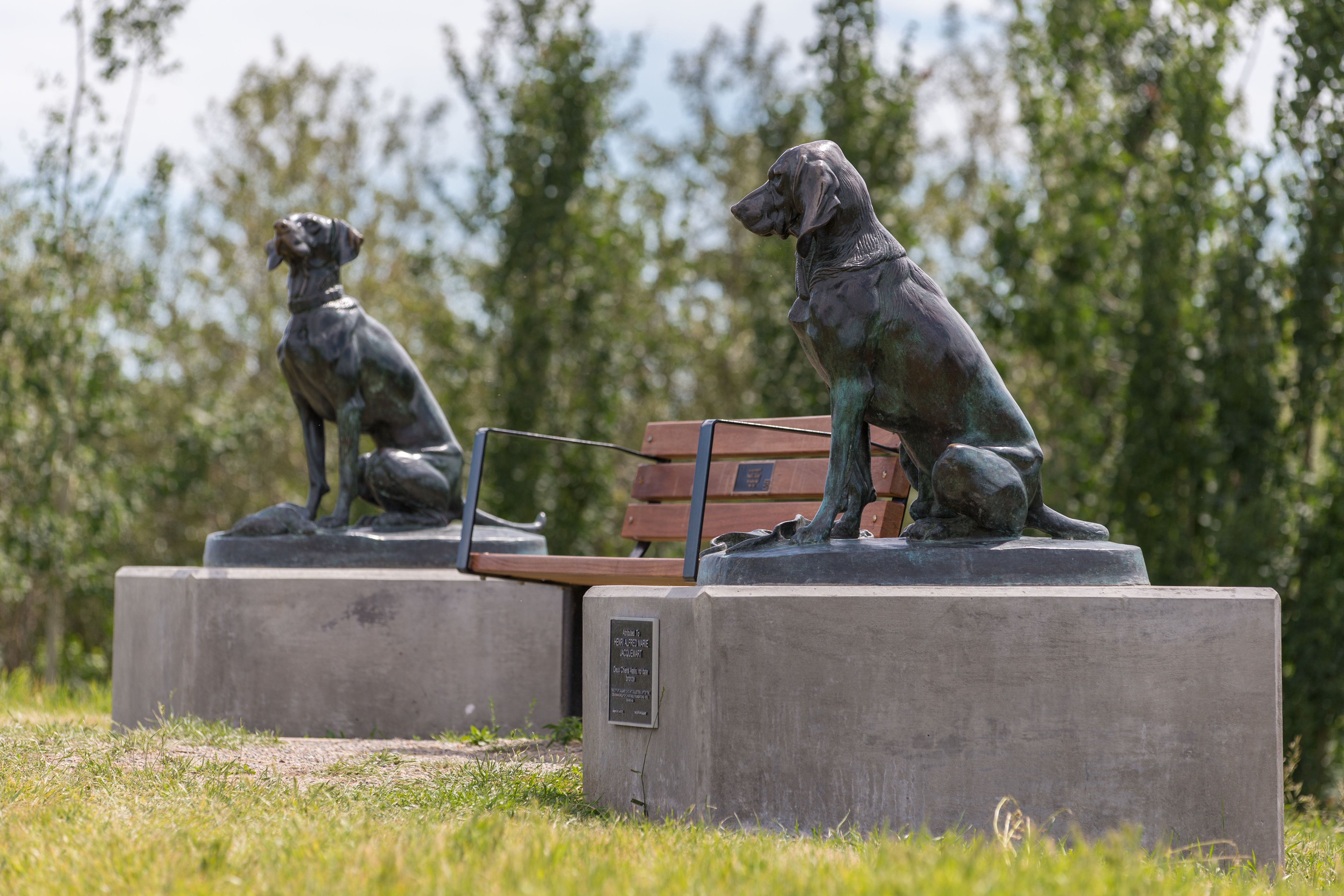 Estimated to be crafted in the late 1800s, the two bronze dog statues attributed to artist Henri Jacquemart are titled Deux Chiens Assis, which means two seated dogs. They were gifted to the City of Calgary Public Art Collection by the Devonian Foundation in 1978. The sculptures are now permanently installed near Nora Tuckey's Grove in Sue Higgins Park.This park lies along the banks of the Bow River and is home to the largest fenced-off dog park in the city. French artist Henri Alfred Marie Jacquemart was born in Paris in 1824 and passed away in 1896. He studied at the Ecole des Beaux-Arts in Paris and exhibited at the Paris Salon from 1847 to 1879. He is a well known sculptor of animals and monuments, and his works can be found in many museums including the Musee D'Orsay.