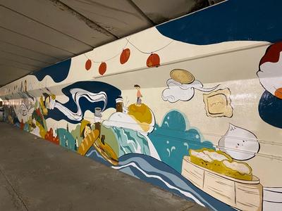 Artist Yiting Hui used food as a whimsical way to tell a story about the confluence of cultures in Canada — how they influence each other to create something new and unique. Just as Asian cuisine has inspired Western cuisine, and vice-versa, both cultures have had powerful impacts on the other. Food brings people together, and Hui uses these cross-sections to create a mural that embraces our shared culture.