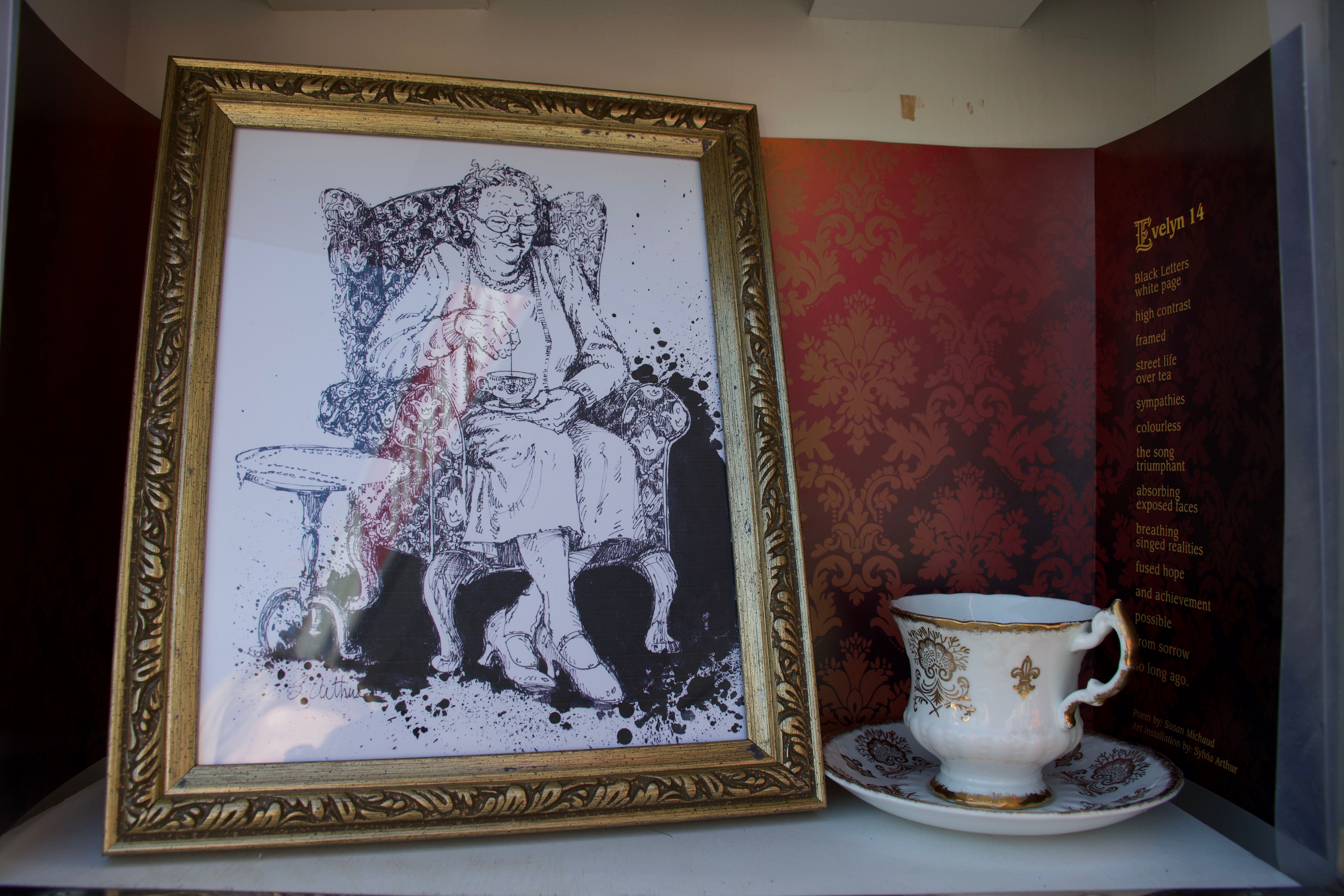My Northeast Mini Gallery artwork is titled Evelyn and was inspired by a poem written by a friend, which is in the wallpaper backdrop. Evelyn is a simple, charming, elderly lady who enjoys the quaint ritual of afternoon tea. She symbolizes a friendly invitation to neighbours to enjoy teatime together.