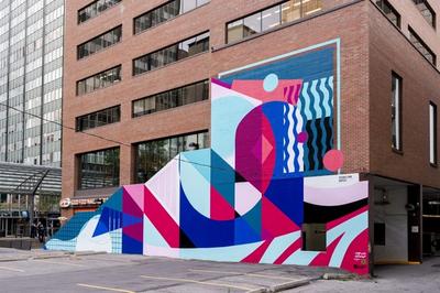 The artist was inspired by the wall having such a unique shape that resembled the mountains, which was a jumping-off point for this mural