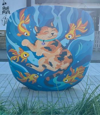 Meet the adventurous calico cat! He has leapt into The Fishbowl, swimming side-by-side with his new best friends. DON'T WORRY! Check his collar tag .... He's vegan.