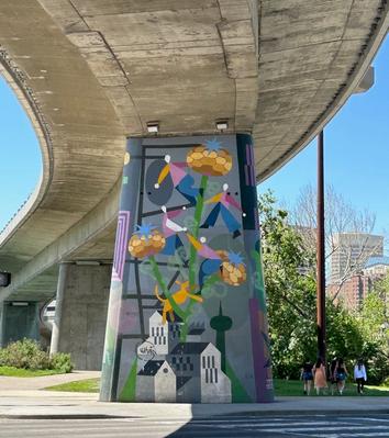 The murals are painted on the abutment supporting the flyover, as well as 3 pillars that support it, representing people moving through their city with visual storytelling that highlights Calgary geography, landmarks and architecture.